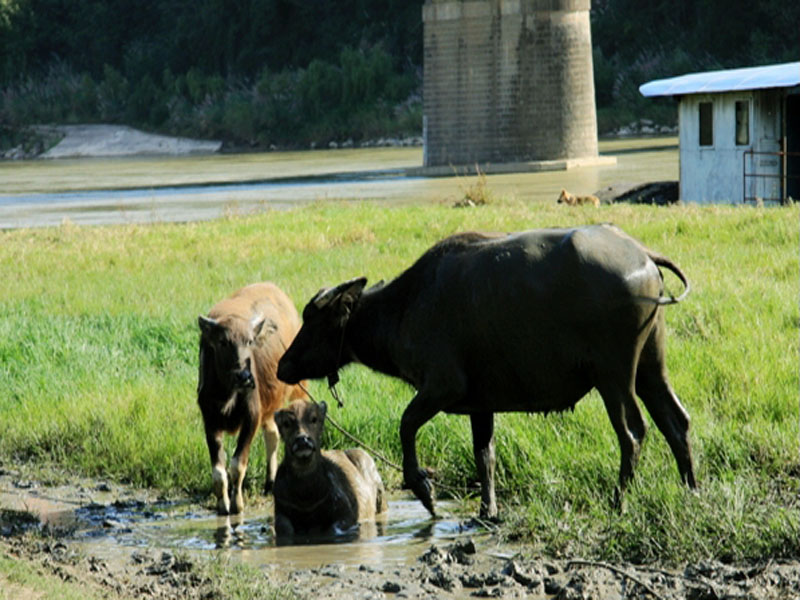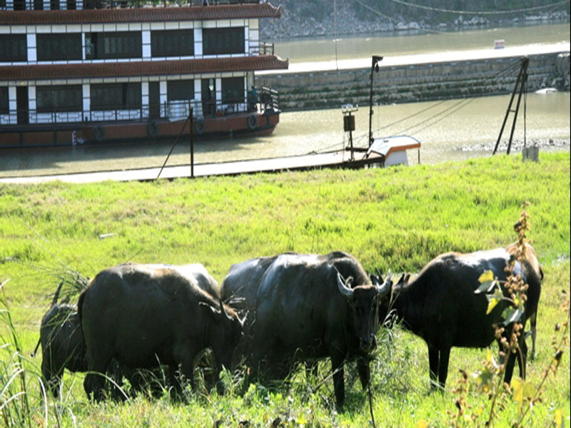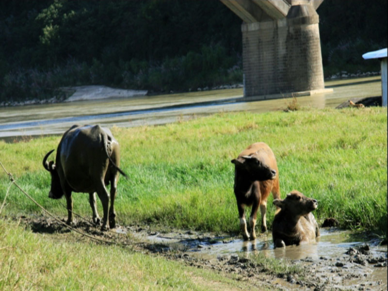 今天闲来无事,又恰逢阳光明媚就想起把我家的大水牛牵出来“散散步”。我一路走到嘉陵江河畔见到已有几家的牛在晒天阳了于是就把我家的大水牛也放置其中。