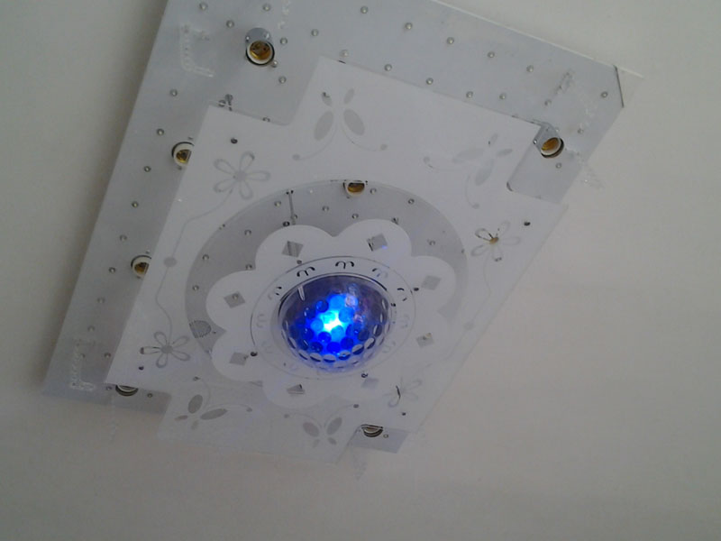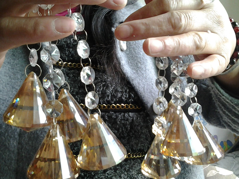 接下来就是安装吊坠,是十二个黄色的钻石样的吊坠。要把它完好的安装在灯上还是挺难的,它与灯的相接处只有一个小小的疑似钥匙圈的小圈,非常的难挂。