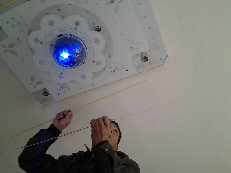 最后一步就是安灯管,它也只是一个起到装饰作用的饰品细细的深黄的。一共有二十四根。安装时要非常的小心它跟玻璃已非常的容易碎。