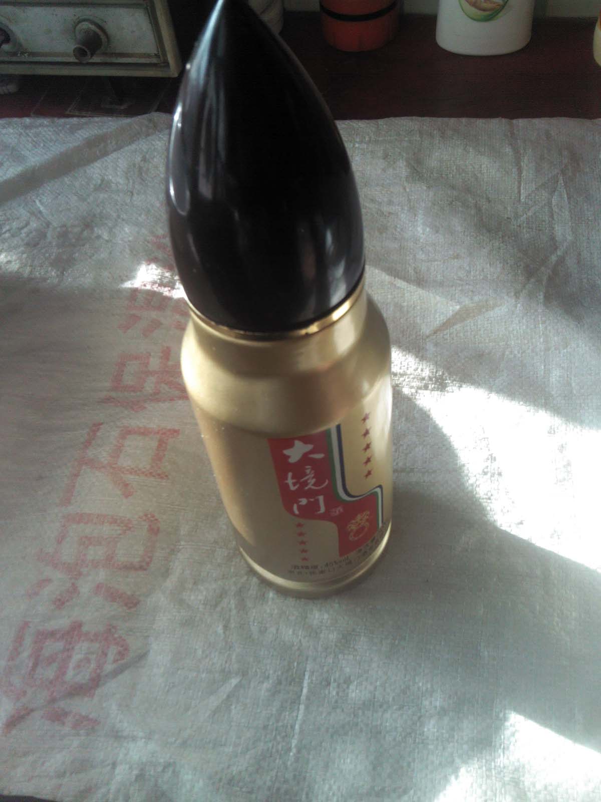 酒名叫"大境门",还是五星的呢。酒瓶太奇特了,上面一个尖尖的帽,下面是金黄色的瓶柱,就像一个子弹,一打就能飞上蓝天。