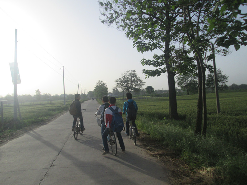 有时我会想,东方的柔和的太阳露出微笑,夹杂着自己的害羞之意从隐约可见的山丘里冉冉升起,照亮大地时,朝着夕阳驶去的,正是一批批的学生,一批批的背影,再与旁边的树木,花草融合一起,是一副多么美妙的画面呀!