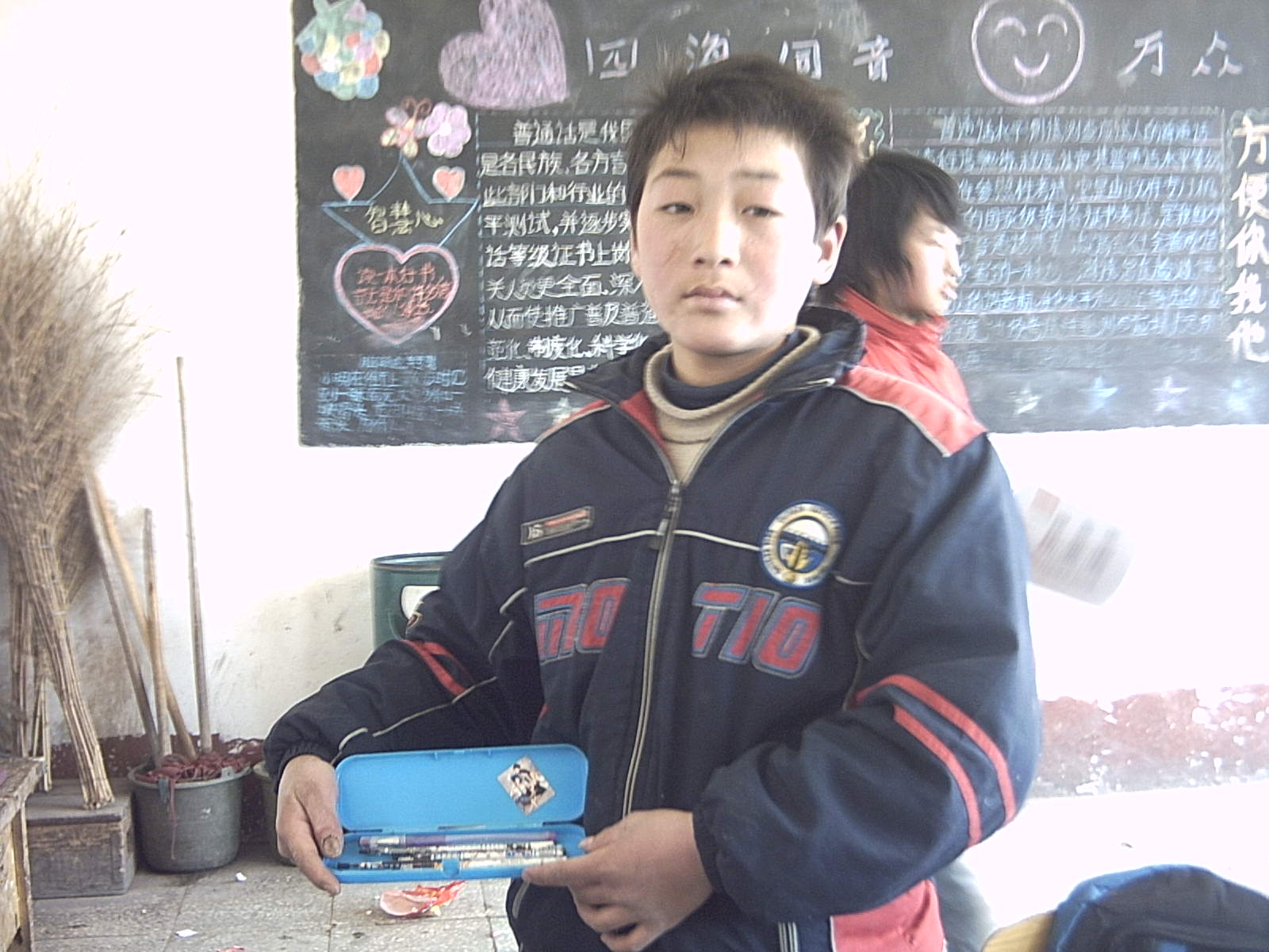 哥哥让他的同学拿着我的文具盒照相,说是给要我留下永久的记忆。我很喜欢这个文具盒,它给了我很多便利,也给了我很大的学习信心。