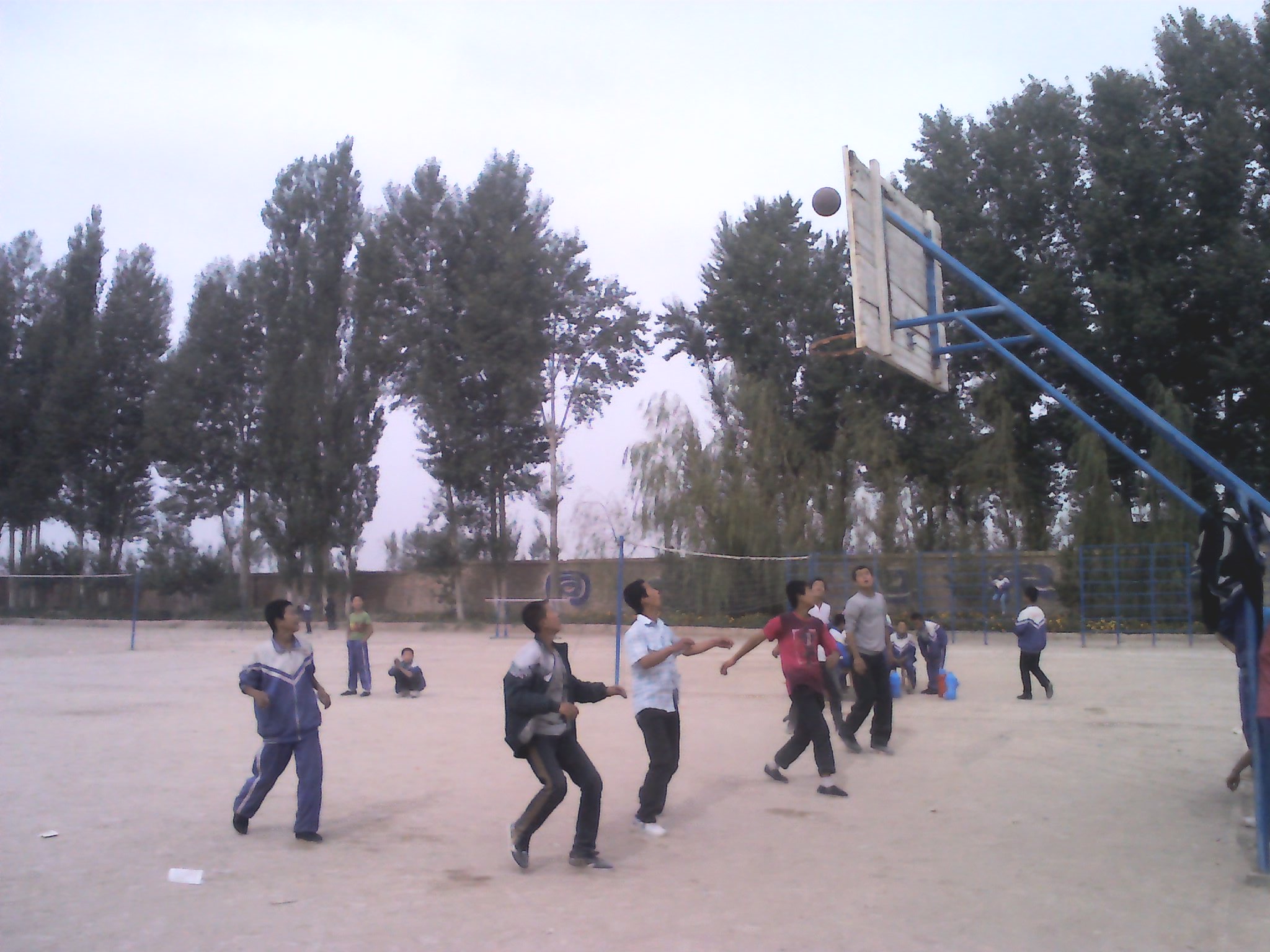 篮球赛场上却是另外一种景象。两个队的队员们龙腾虎跃、互不相让。他们带球、传球、避让、投篮。机敏的动作和精彩的进球博得了师生们的阵阵掌声。