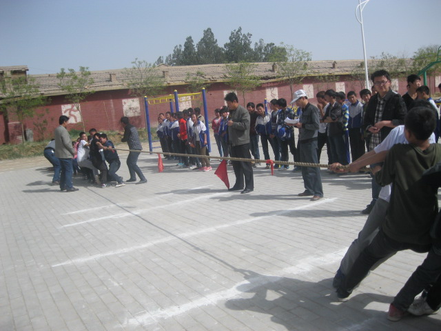 麻绳中间的红绸子忽左忽右,我们的心也像红绸子一样晃悠着。双方都咬紧牙关坚持着,忽然间对方好像吃了大力,我们的脚下一滑被拉了过去,糟糕!快要过线了!观看的同学们有的继续扯着哑了的嗓子喊加油,叫喊声此起彼伏;还有的同学急得直跺脚,恨不得上去帮一把,在这时,赵老师伴随着有节奏的哨声,挥动着手臂,毫不放弃在为我们助威,瞬间好像奏响了奋发的号角,加油声响彻了操场上空,我们的队伍又振作起来,似乎拥有无穷的力量,就在这千钧一发之际忽然迸发出来,很快扭转了局面,对方似乎不敢置信,恍惚间兵败如山倒。