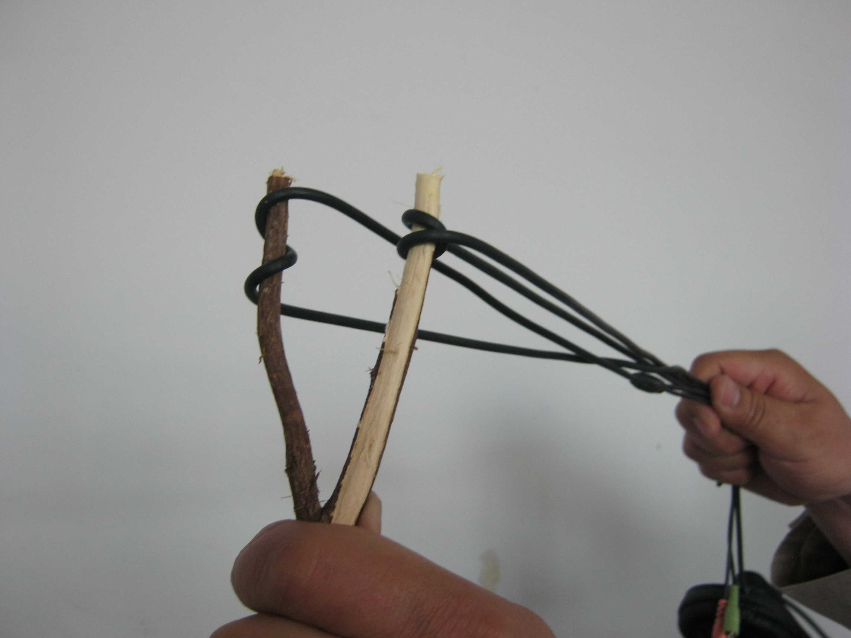 做弹弓首先就是要选材料,手柄一般都是用木头做的,不过找这么一个较粗的木杈,这是不容易的,我找了整俩天才找到一根合适的呢!接下来就是找两根等长的橡皮筋,用铁丝把橡皮筋的两头绑在找到的那个木杈手柄上,之后就得找一个结实的"弹包",其实就是一块布一样的东西,连接橡皮筋两头,这样,一把弹弓就制作完成了。
