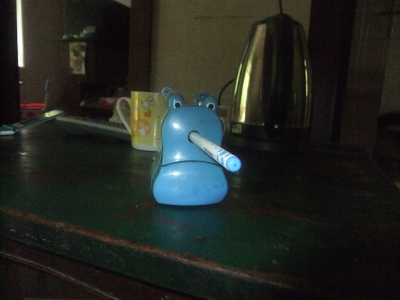 我的削笔机,看似很简单。它主要由摇手、头盖、顶盖、触角、铅笔屑盒几部分组成。摇手在一侧,触角像两个小耳朵似的在头盖上方的两边贴着,好像在静静的倾听着世界。铅笔屑盒在头盖的下边藏着,头盖上还有一个圆形的插口。这一切的组成离不了主要的身体部分,他的整个身子就是一个简单的小狗。就因为如此,我叫它小狗削笔机。