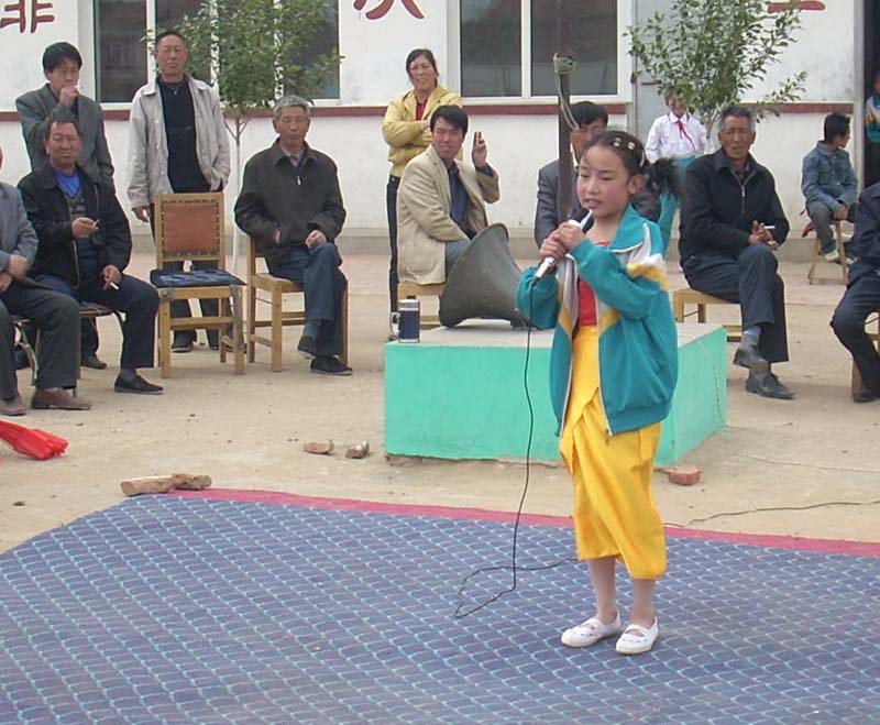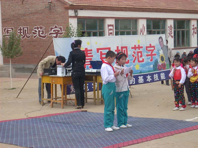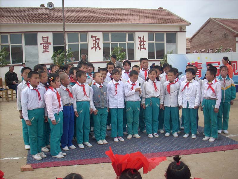 最后一个节目是大合唱《让世界充满爱》,我和黄晓博不会唱,就悄悄地躲在队伍里,等他们唱到最一句时,我们出去说:"六一文艺节目至此结束,谢谢大家。"我俩说完就跑下台去卸装了。