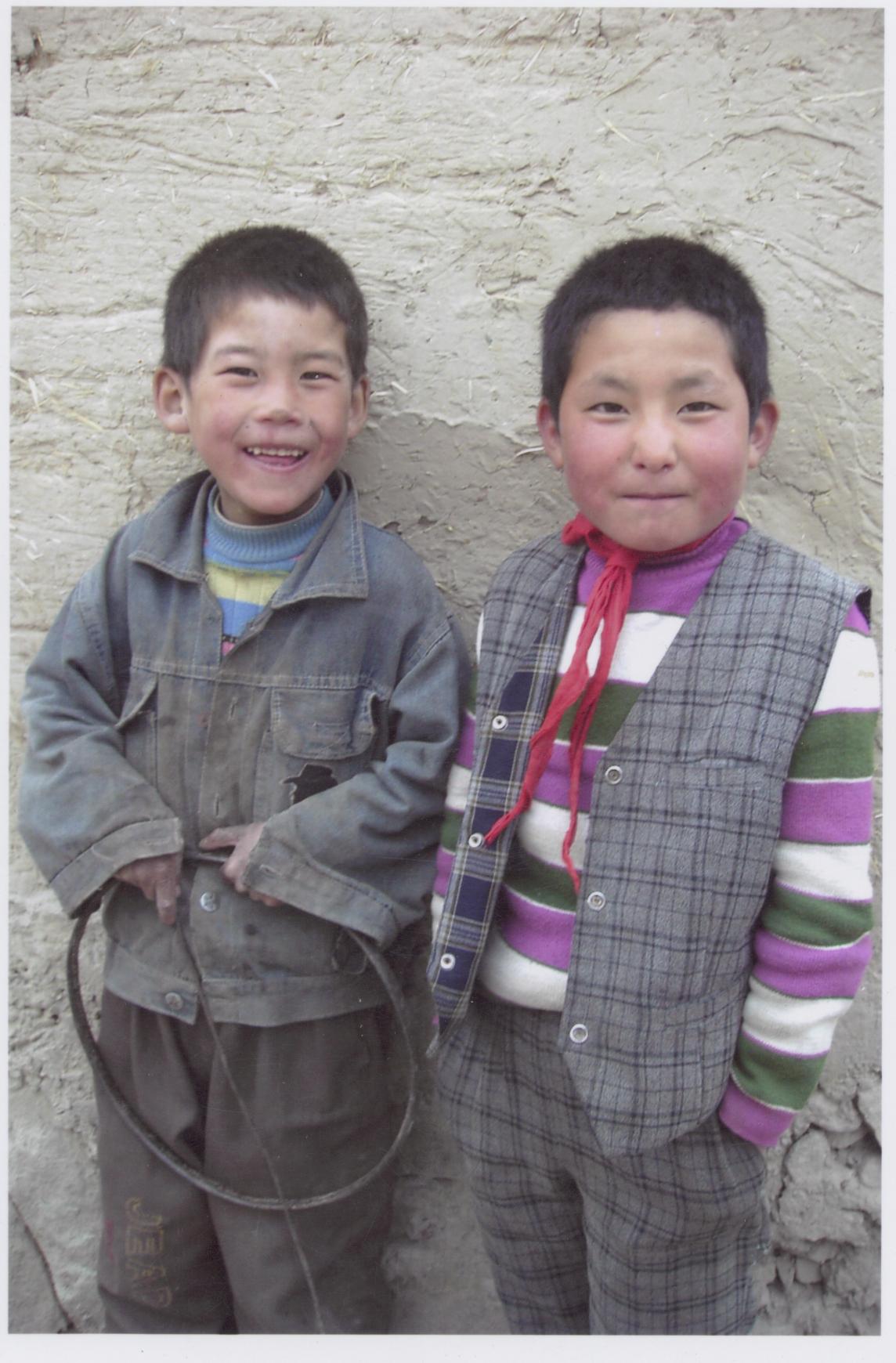 这两个孩子显然比别人就辛福多了,因为他们已经有书可念了,并且已经戴上了红领巾,右边的这个小孩子家里还有个爷爷和奶奶,收拾打扮的还蛮干净的,而左边的这个小孩可就不一样了,因为他只有爷爷照看,衣服不知什么时候破了一个洞,但还没补好,爷爷为了不让他闯什么祸给他做了一个铁圈,让他玩,显然他们已经见到很多人了,对我们的相机也一点不陌生,还要扮个鬼脸呢。