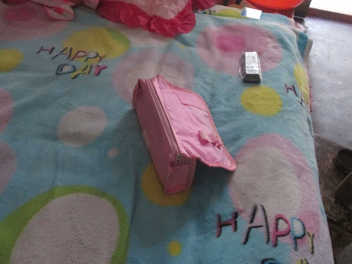 合上这个铅笔盒,有一个大约5厘米的拉链,上面有两个小心,在心上用墨笔店了许多墨,点,拉开拉链,我放的是每天所记的作业,或几毛钱。