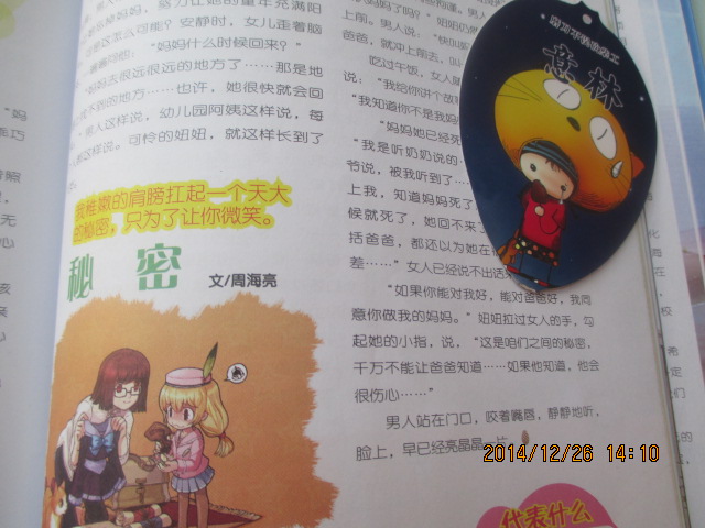 我印象深刻的一篇故事书是《秘密》。文章中的父亲为了不让刚满一周岁的女儿知道妈妈去世的事实,便骗她说妈妈出差了。在女儿六岁的时候,爸爸又为她找了一位新妈妈,并说这就是女儿的妈妈。爸爸以为女儿当时还小,不记得妈妈的样子,能蒙混过关,这时的女儿也如愿以偿地懂事的叫着妈妈,眼睛里有亮晶晶的东西在闪动。可是下午她偷偷对新妈妈说:“我知道你不是我的妈妈,妈妈已经死了,但你能对我和爸爸好,我就同意你做我的妈妈,但你不能告诉爸爸,爸爸知道妈妈去世会伤心的……”六岁的女儿脸上是一脸的坚毅,爸爸却在身后哭红了眼睛。从一岁到六岁,五年的时光就这样在父女互相善意的谎言中平静的逝去,幼小的女儿把对妈妈的思念埋藏在坚毅的微笑背后,为的只是不让爸爸担心。为了爱,女儿稚嫩的肩上扛起一个天大的秘密,在谎言中编织着最美的亲情。