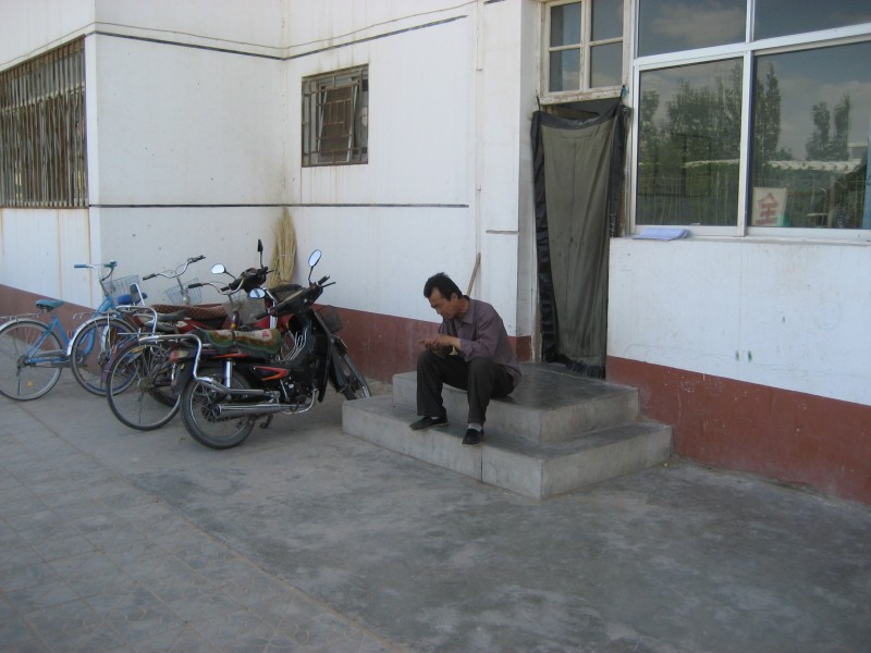 闲的时候,他会坐在值班室门前的台阶上,望着学校,守护着学校,从他那双炯炯有神的眼睛中可以看得出来。他保证了我们自行车的安全,保持了学校前大门区域的卫生整洁,认真负责的老大爷,您辛苦了。