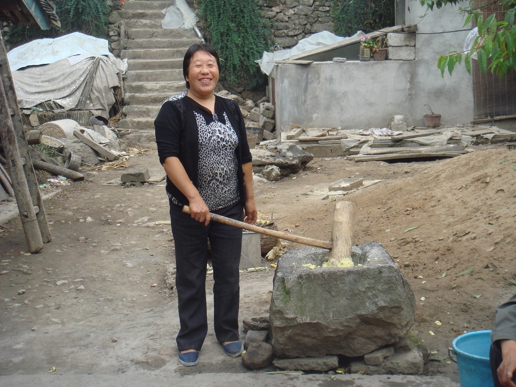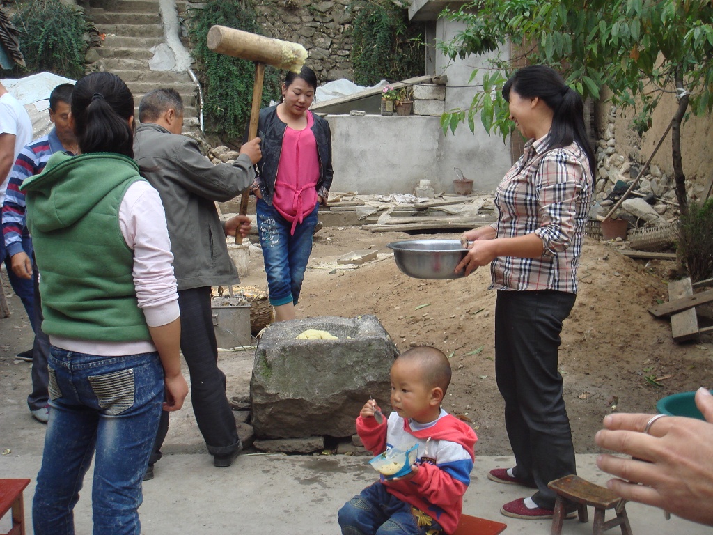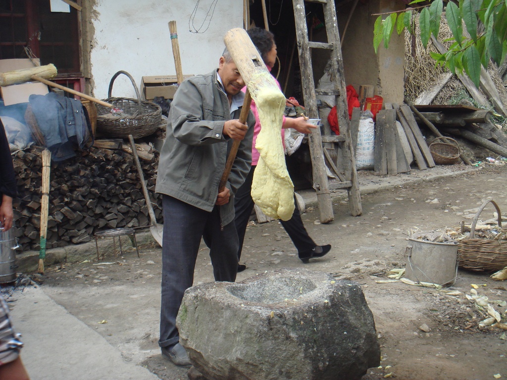 在经过无数次捶打的糍粑仍不妥协,依然坚持它的"真理"。但人们也是非常聪明的,他们一边打一边倒水,使糍粑不粘到木杵上。就这样,糍粑也渐渐退缩了,终于一顿丰盛的晚餐完成了!