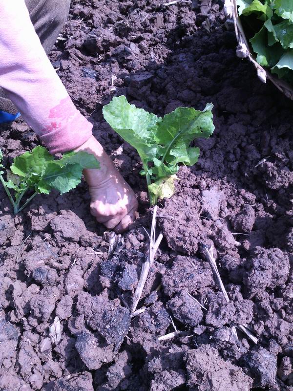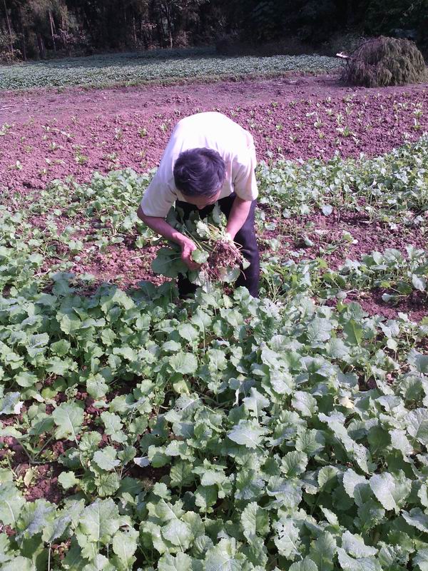 菜籽就像玉米的栽种方法一样,先把菜籽种在一块地里,等它长成小苗苗,再“移植”到另一块地里。我到这边地里时,外公正在扯菜籽苗,我便帮外公一起扯。