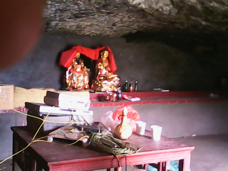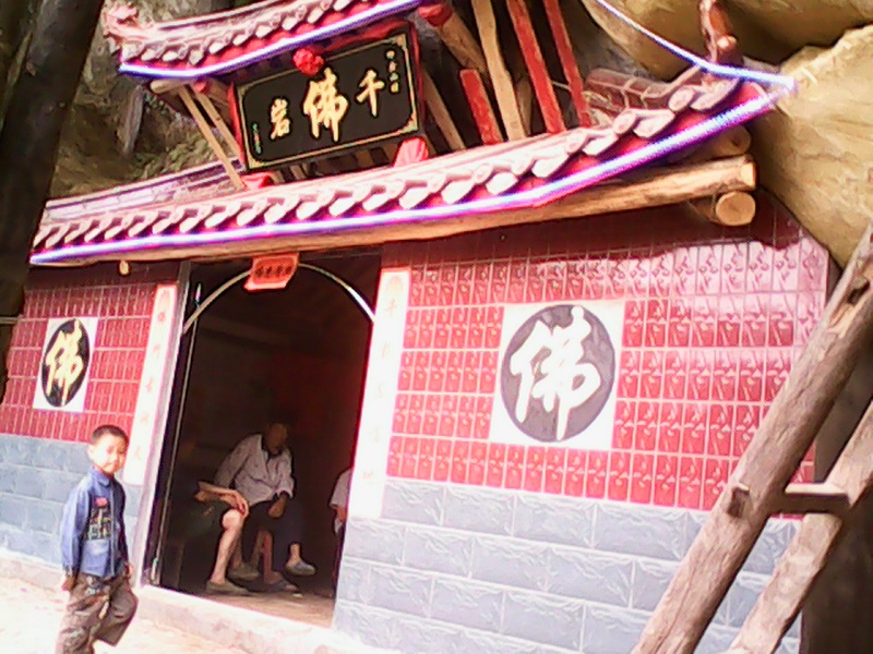 千佛岩,地处一座山的半山腰,地势陡峭,原是山中的一个极大的山洞,因在战乱时期,农民们在此躲避战乱,并生活了一段时间,后又发现了许多龙骨化石和天然石笋,我们村才决定将庙宇建在此处,目的是让人们记住此处的历史。这座庙宇并不大,因是在悬崖边上,山洞旁边,修建时,并没有修整山洞,而是倚着山洞,只是在山洞门口建起一个与庙宇一样的门面,而进入门里就是山洞。