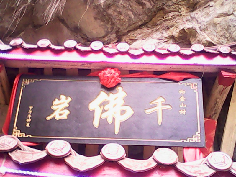千佛岩,这座庙宇的外面是用暗红色的瓷砖砌起,在门的两侧有两个金色的佛字,再上面一点是一小层湖蓝色的瓷瓦,瓷瓦上面有一块牌匾。牌匾黑色,字金色。上面雕刻着"千佛岩"三个大字。和"甲午年仲夏"几个字,显得庄严神圣。牌匾上还有红绸布的花立在上面,这是生辰的代表,上面又是一层湖蓝的瓷瓦。进入千佛岩,里面有两尊金光闪闪的菩萨端坐在山洞中,其实山洞很深,只因为要把佛放得下就将里面的山洞封了,只是在侧面留了一个小口。在庙内有一张大桌子,上面放人们来时带来的香油,草纸,香,蜡,鞭炮等物品。在侧面,光阴暗,人们在那里的泥土插上香和蜡。