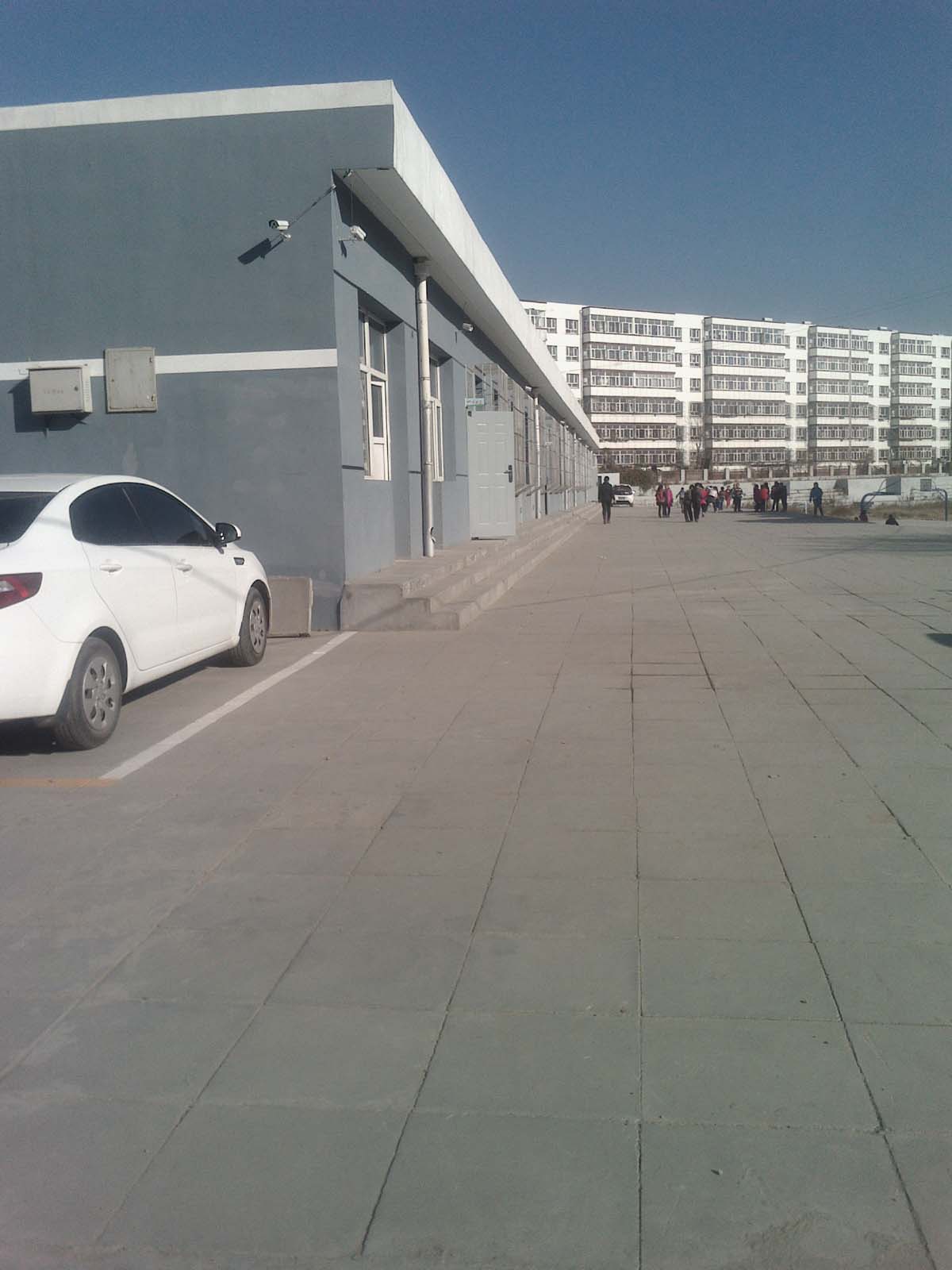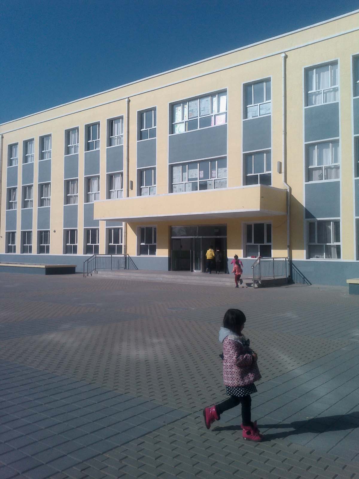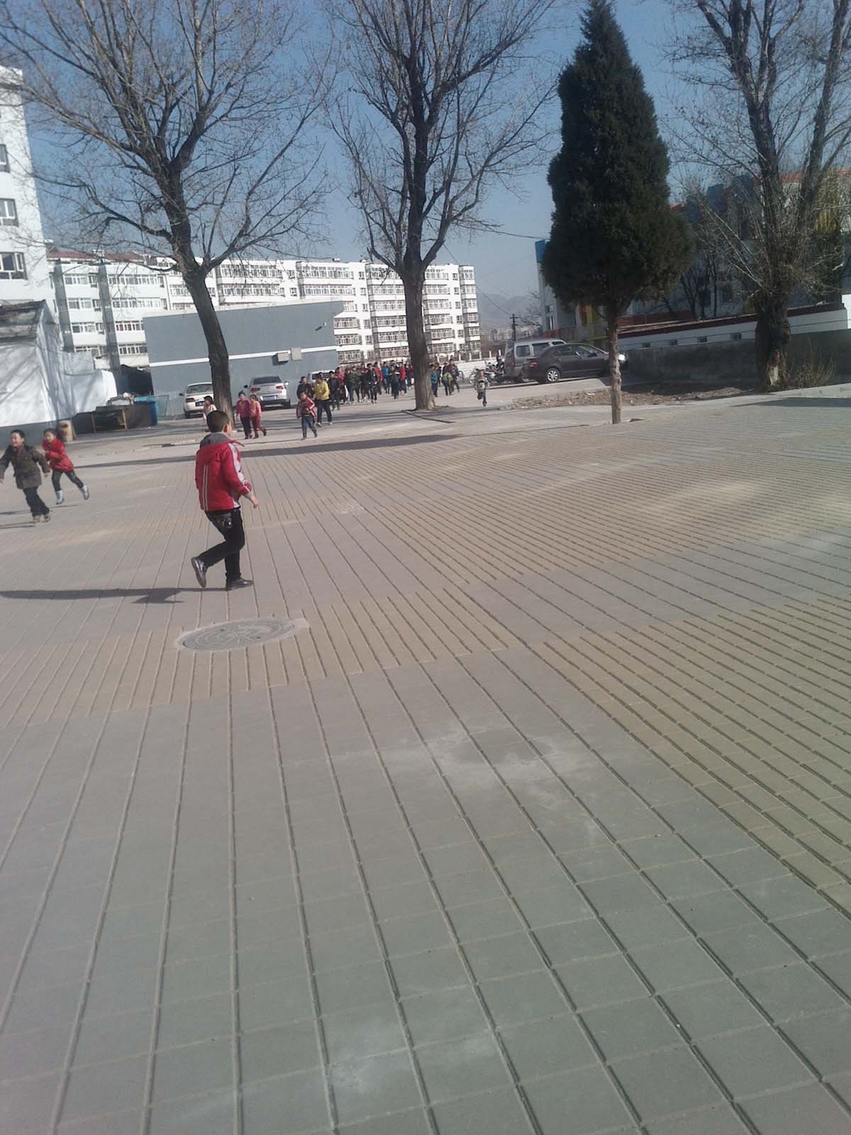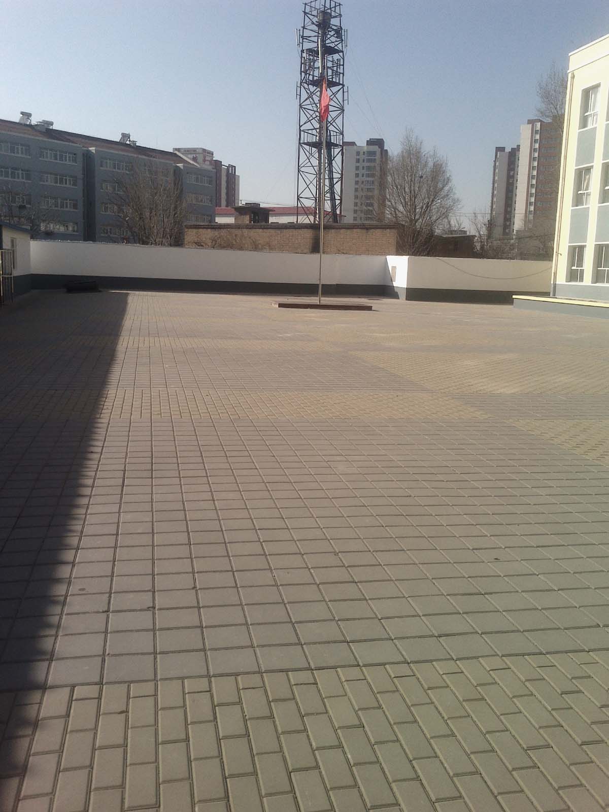 再看楼前的校园,校园很大,也特别平整。紧靠楼房的是两个大的长方形的花坛,校院里铺的地面也相当讲究,是用两种砖铺成,一种是黄色的,一种是灰色的,它们有规律的铺成黄一块,灰一块,兑成非常美丽的图案。