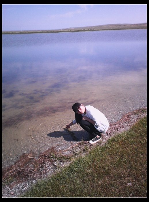 吃过早饭后,我们怀着愉快的心情向青海湖出发了. 一路上的我可以用"身在曹营心在汉"这个成语来形容。还没到青海湖呢,我的心早已飞到那里了。青海湖虽然不是第一次去,以前我去过那里好几次了,但次次都让我领会到不一样的感觉,总觉着那里有股魔力吸引着我,让我去过之后还想再去。从车窗里望着沿途的风景,虽然人烟稀少,甚至有点凄凉,但那满片的绿色和成群的牛羊依旧成为一道亮丽的风景线,显示出藏族地区特有的,淳朴的美。在这种美景的伴随下,时间过得跟箭一般,不一会就到青海湖了。 青海湖远处似乎与蓝天连接在了一块,一眼望不到边。智力的天空格外的湛蓝,跟蓝宝石似的。到湖边,我拿出手机迫不及待的想要把这里所有美好的一切都用相机记录下来,我拍了许多照片。拍完照片后我迫不及待的蹲下身来,把手伸进湖水中,大概是还在夏天,而且今天天气特别好的缘故,水并没有我想象中的那么冰凉。我把鞋子脱下来,卷起裤腿冲向湖中。不到一分钟我就跑出来了,因为站太久,依旧会感觉冰冷难耐。我用手拍打着水花,湖水清澈见底,有时还会看见几条小鱼。湖底的细石直视无碍,被湖水打磨得很光滑。我捡了几颗比较好看的装在一个瓶子里,还灌了一些湖水。