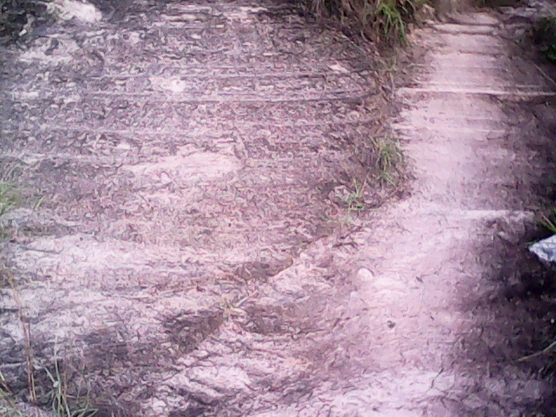 野果吃完,走到石坝上沙多的地方你会发现有一些被烈日晒干的黑色物体,这物体是那一路上的特色——地木耳。地木耳在四五月时的雨后生长生长在沙子上,与生长在朽木上的木耳没有多大的区别。我也吃过地木耳,只是在清洗的时候有一些麻烦。有时吃地木耳你会发觉8它比朽木上生长的木耳更美味。可以吃的都说完了,下面就要说景了,首先是一种奇特的石阶梯,平面上的感觉,一层一层的像蚌壳上的纹路,立体上看非常像牛屎,我便戏称它"牛屎山"。这种石梯别的不好,最好的便是它不长青苔,下雨天也不害怕会被摔倒。