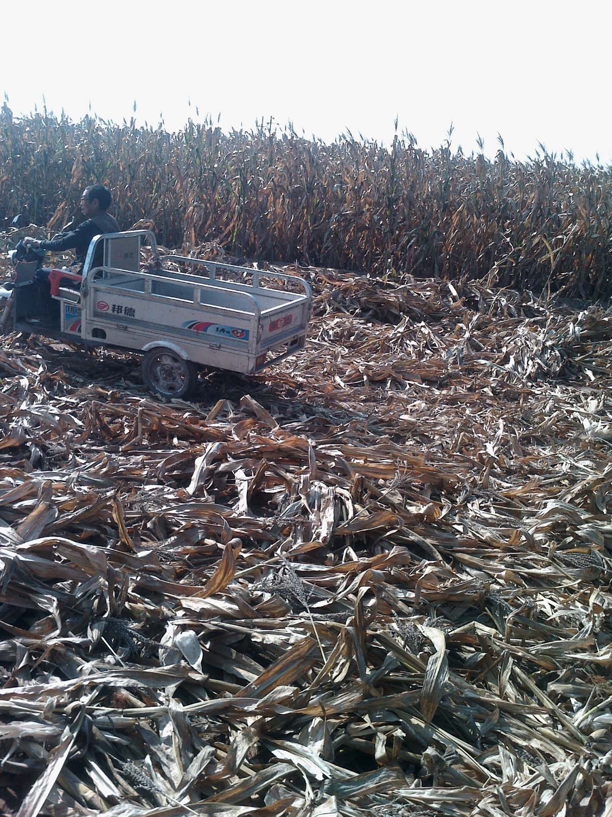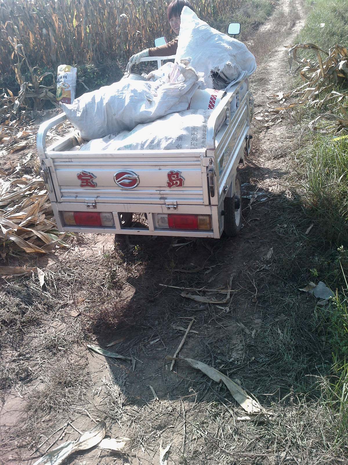 今年,我去了地里,见着很多拉玉米的车,不见了牛车,不见了拖拉机。每家每户都有了自己的工具,那就是摩托三轮车,还有电动三轮车。摩托三轮车大,能拉很多玉米,而且也有劲,在玉米地里来去自如。电动三轮虽然小,但很灵活,每次拉个七八袋玉米也不成问题。