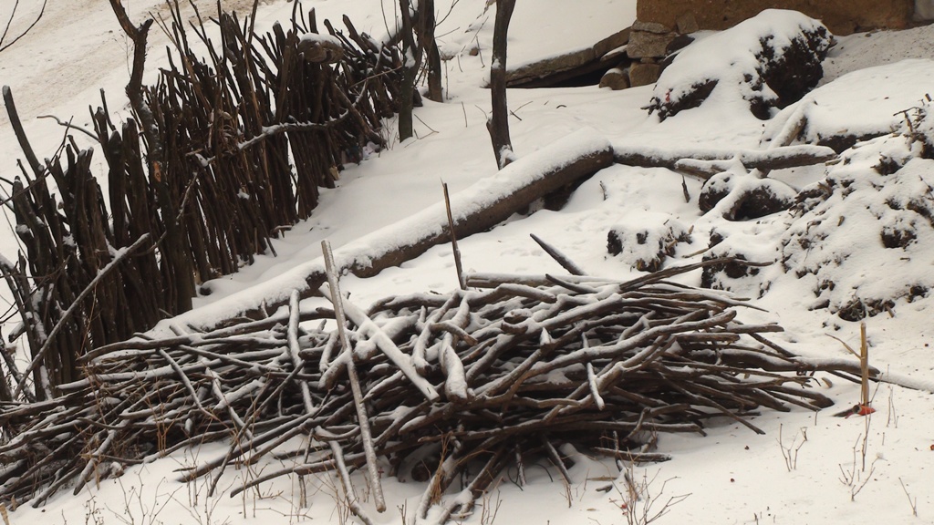 这是我家屋外的情景,房屋上的瓦砖上堆满了雪,整个世界呈现出一派和谐的景象。雪大片的覆盖着土地和房屋,就连树、山坡、杂草都被雪所侵占。我站在家门口,看着洁白的大地、洁白的天空,行人的脚印不一会儿就又被大雪覆盖了,就连门前都有不少的雪花。