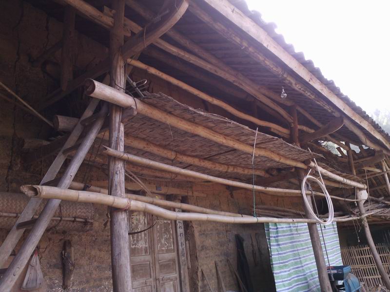我家土房子外和室内都建有一层“楼”,这楼可与水泥建筑不同。与其说是楼,倒不如说是一个搁东西的空间。它用篾条编成的一个隔板将上下隔开。室外的“楼”一般放柴,室内的就放些杂物。这“楼”都需要借助梯子才能上去。