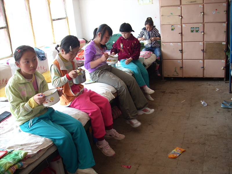 等到刮风下雨时,我们就不得不把 "餐厅"挪到教室里,望着窗外的风雨,坐在凳子上就餐也不为一种享受。