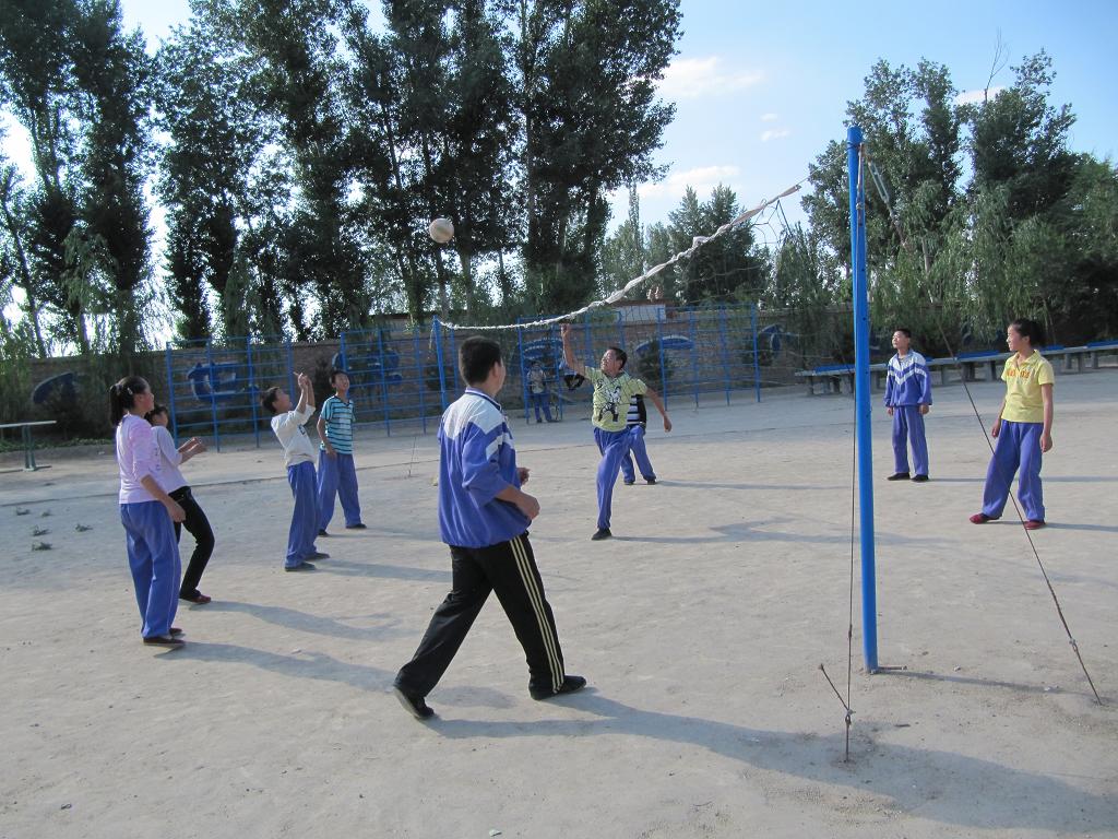 看,西边的排球爱好者们正在进行激烈的排球比赛呢!他们打的多精彩呀!这边的同学刚把球发过去,那边的同学一个箭步冲上前来,把球挡了回去,一来二去,排球在空中转了几个回合。