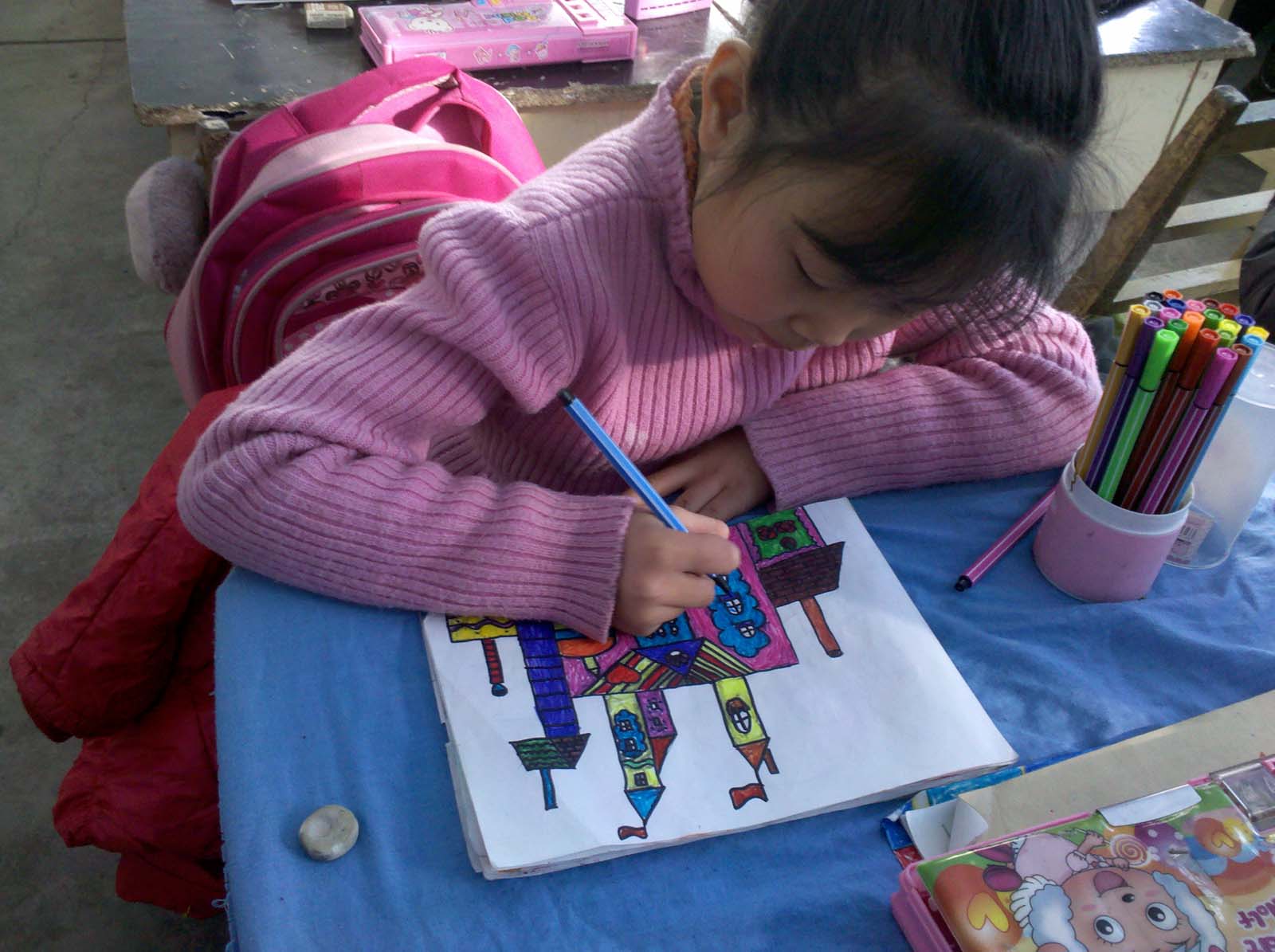 现在我坐下画画,一画就是二三个小时,陶醉在画海中,我把自己的高兴、愤怒、欢乐都画在了画中,我喜欢画画。