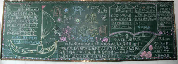 各班积极响应,查阅资料,收集有关环境保护的小知识、小事例、小方法等,各班创作的黑板报图文并茂、风格各异、内容丰富、立意新颖、版式美观、标题醒目大方、图文布局合理,突出了原创性,体现了我们的想象和思维能力。