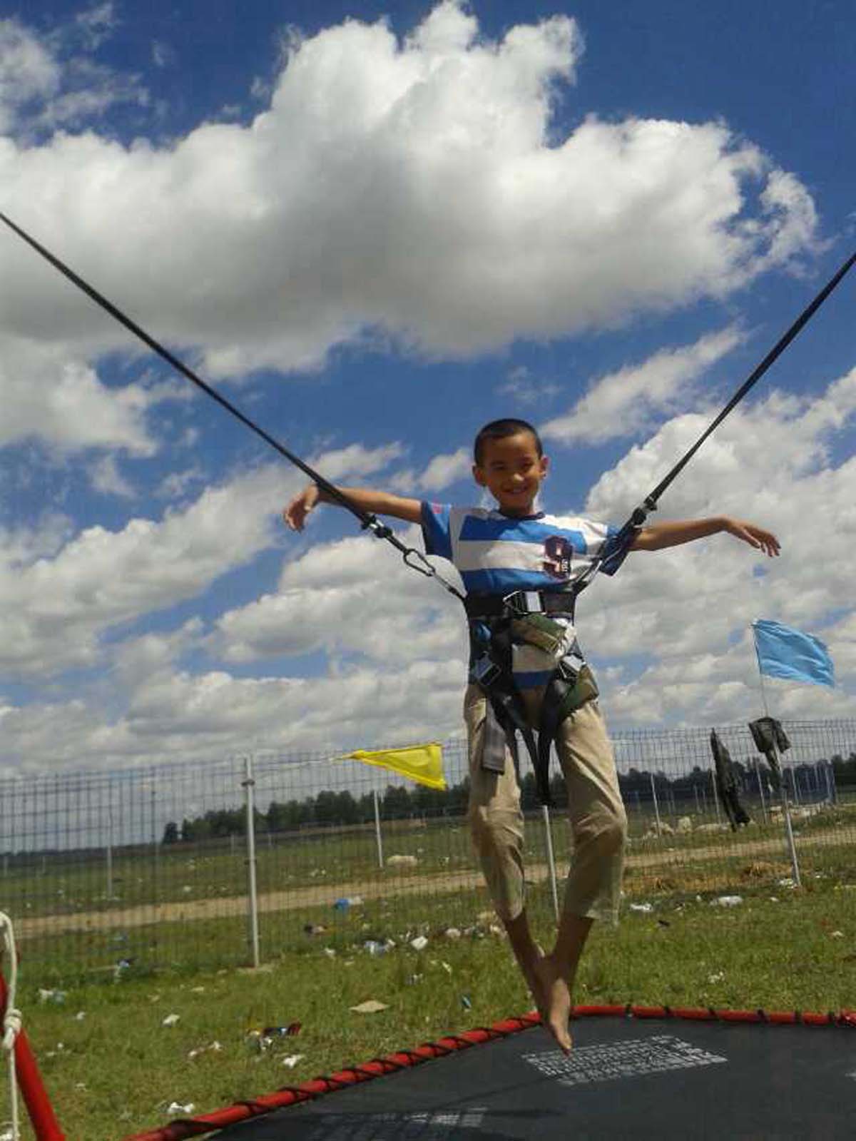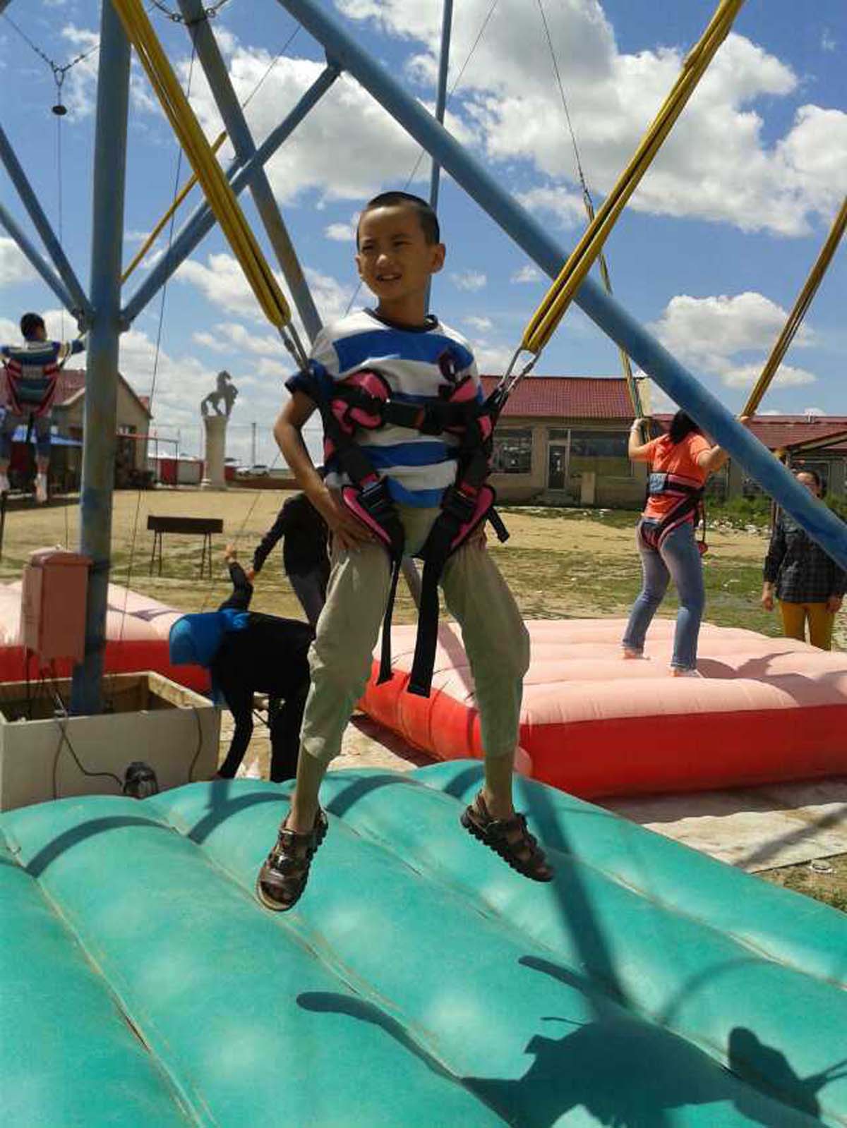 我们进到里面,就被众多的游戏设施吸引了。有蹦蹦床,还有碰碰车,什么样的游戏都有。我和弟弟跑向了蹦床。工作人员把我们武装好,上面有两根弹力特好的绳子,轻轻一蹬床,身体向火箭一样飞向天空,那种感受好极了。我们不停地跳来跳去,好开心啊。