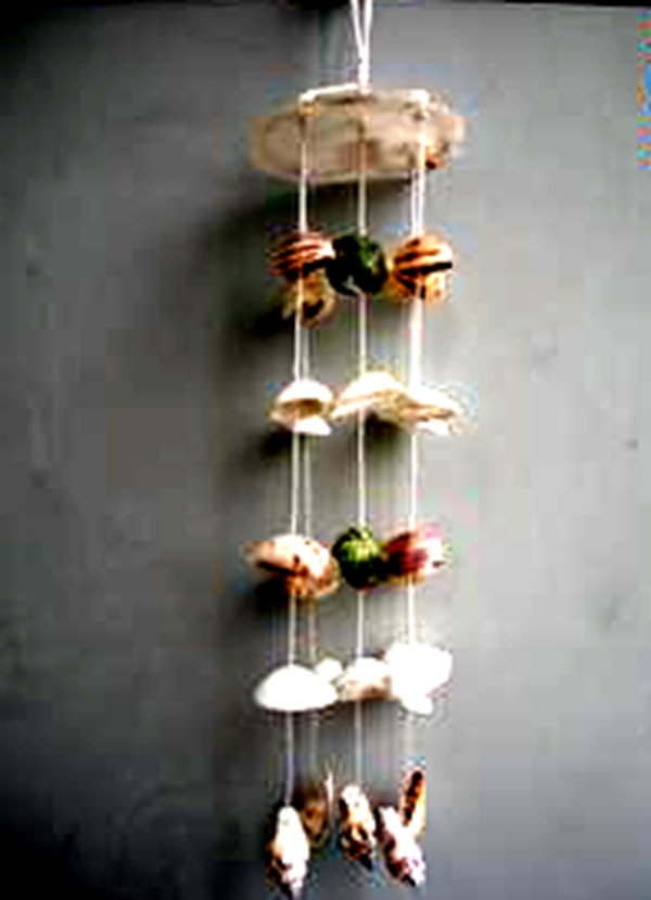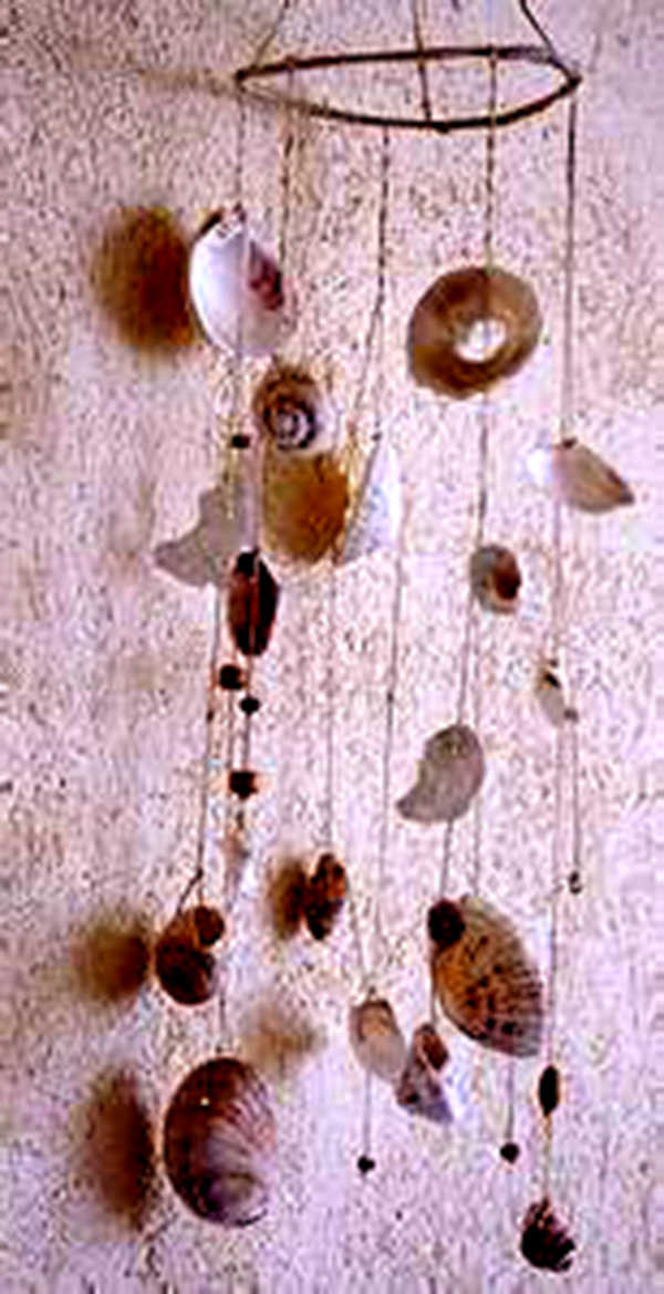 闲来无事,看见家里闲置的贝壳,突发奇想地要做贝壳风铃。首先,找好材料:贝壳,软木垫,小石子,乒乓球,颜料。准备就绪后,就开始做了。第一步,把贝壳粘在棉线上,接下来把一块软木垫切割成圆形,再把粘好的贝壳串在软木上,固定好。第三步,把棉线穿过软木,再粘一粒小石子,并固定。第四步,在软木和乒乓球上涂上鲜艳的颜色。最后把乒乓球和一些小饰物串好,一串漂亮的风铃就做好了。然后找一个合适的地方挂上,便可静心聆听这风中的传说了。