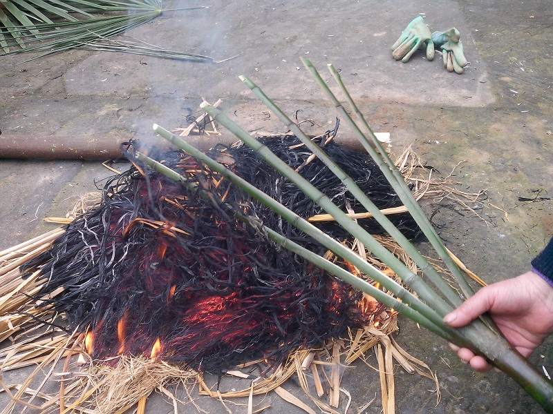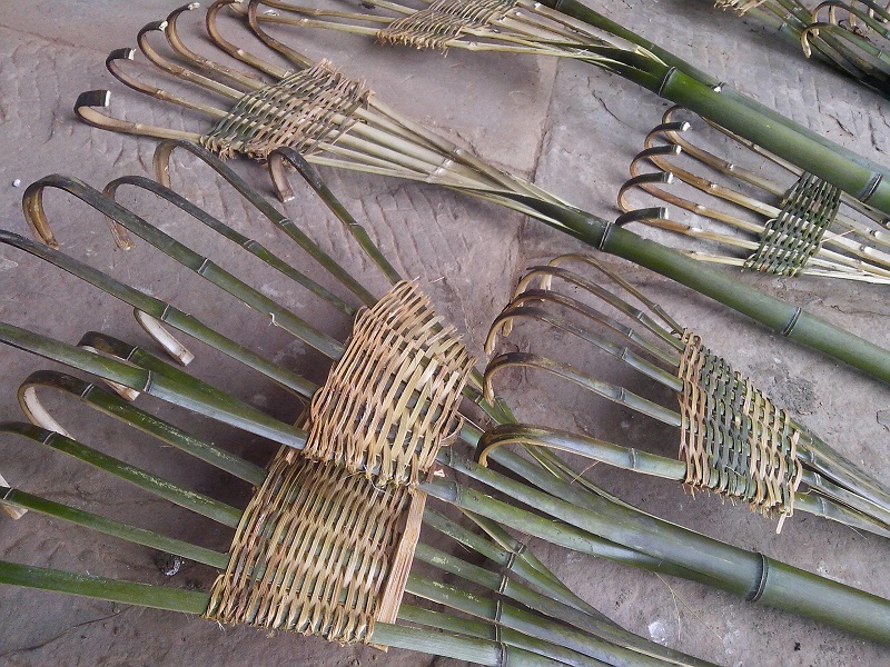 制作筢筢,首先需要几根细竹,材料花费并不多,一根细竹就可以做成一个筢筢。将细竹取两米左右的长度,在一端用刀均匀地剖成六或七条竹片(大约剖40厘米长)接着就在火上烘烤竹子与竹片相接的地方。目的是让竹片变软。待到竹子与竹片相接的地方出现黑点时,就立刻将竹片均匀地摊在地上,并用脚踩住竹子与竹片相接的地方。目的是固定形状,注意不要太用力。