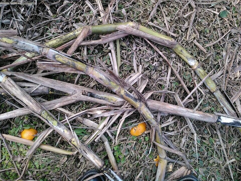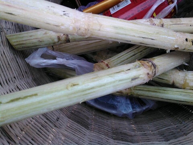 砍断后就用刀把甘蔗上的叶子扯下来,邻居将这叶子拿去喂牛。接着我们就用刀刮去甘蔗上的黑斑或灰黑色的东西。这样才能保证甘蔗握在手上不脏手。