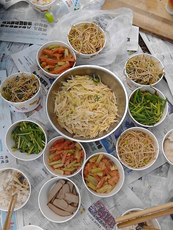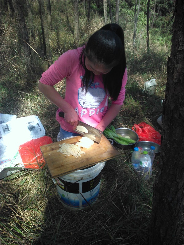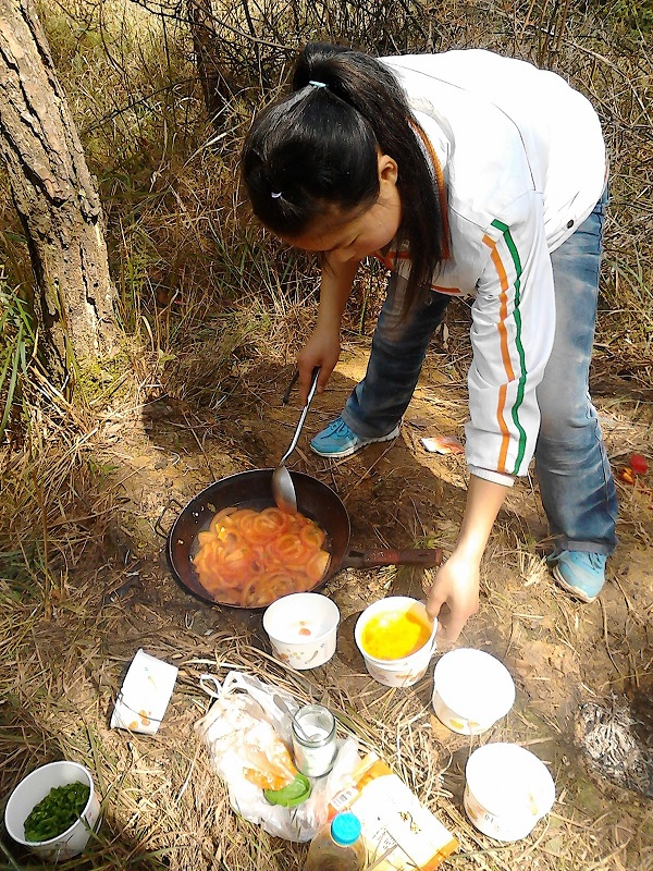 切好所有的菜后,彭仕林就在热烘烘的炒锅旁炒菜了。对于我们这些在野外炒菜的"老手"来说,做些豆芽、莴苣、蒜苔、青椒、番茄蛋汤根本不是什么难事。很快我们就吃饭了,虽然都是素菜,但却异常的美味。因为这是我们共同努力的结果!