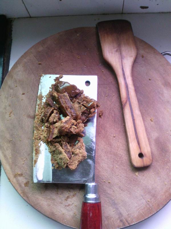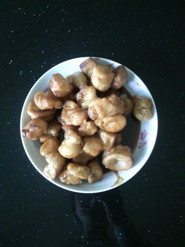 妈妈把刚才炸好的“灰扯面”下到锅里,让它们裹上红糖。如果想吃软一些,则可以适量的加一些水。过了一会儿,“灰扯面”馍馍出锅了。刚才金黄的馍馍穿上了一件黄褐色的糖衣,盘子下铺着一层糖稀,令人食欲大开。我迫不及待的夹了一个放在嘴里,外酥内软,甜而不腻,我马上狼吞虎咽地吃起来。