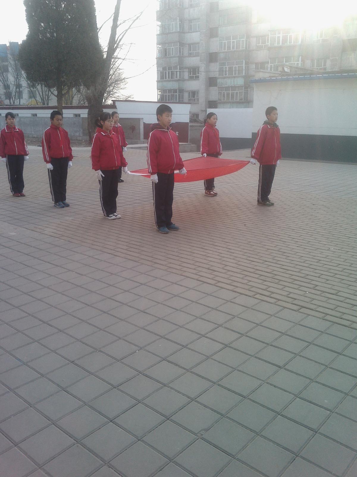 在音乐声中,八名同学护卫着鲜艳的五星红旗,迈着整齐的步伐走向国旗台。随着国歌响起,五星红旗在冉冉升起。我们都行少先队队礼,目光随着国旗而移动。