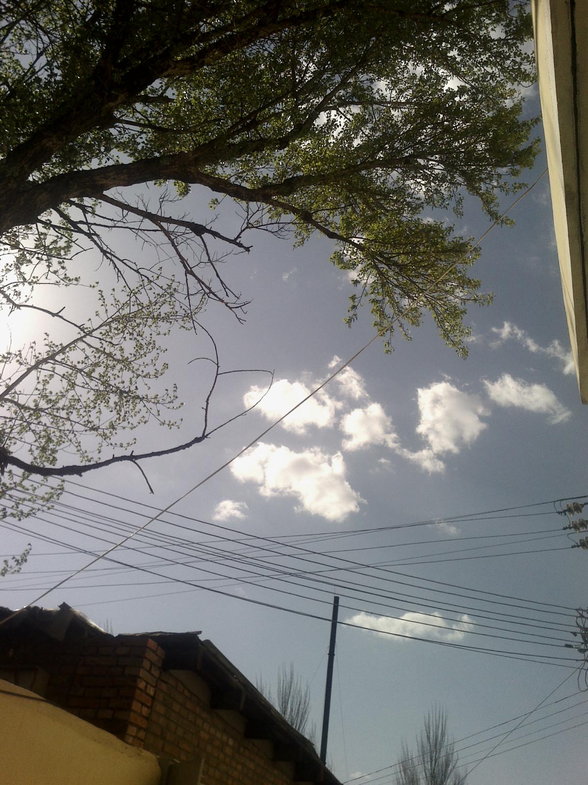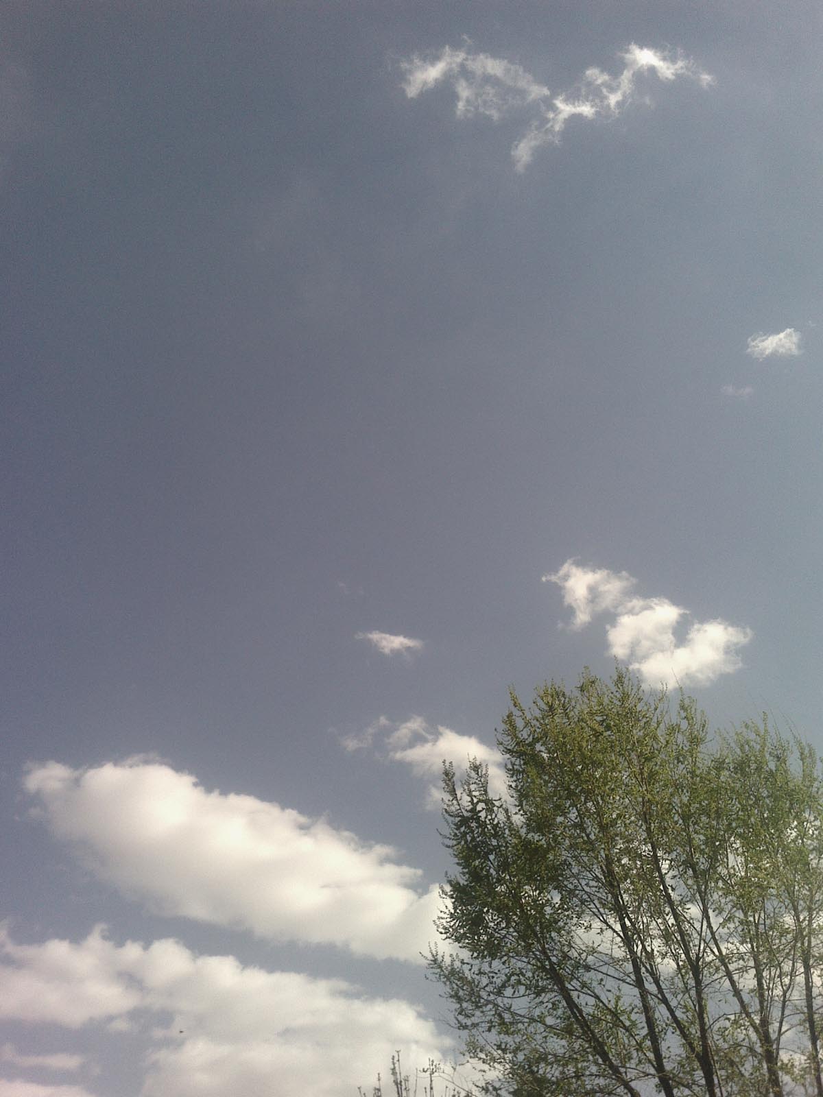 一夜的大风把天空吹得瓦蓝瓦蓝的,天空飘着几朵洁白的云,再看蓝天下的树枝,笔直地伸向天空,每条树枝上都缠着嫩绿的树叶。绿叶和蓝天,白云,组成一幅多么美丽的图画啊。
