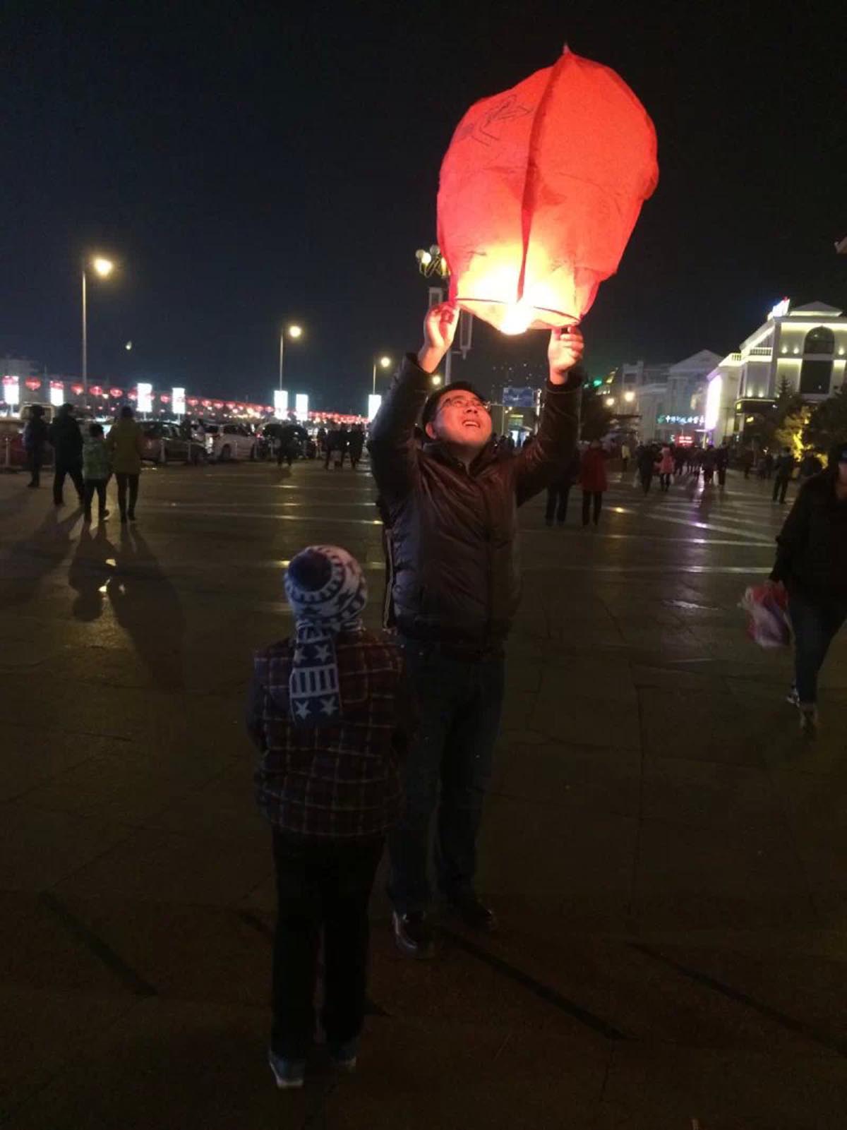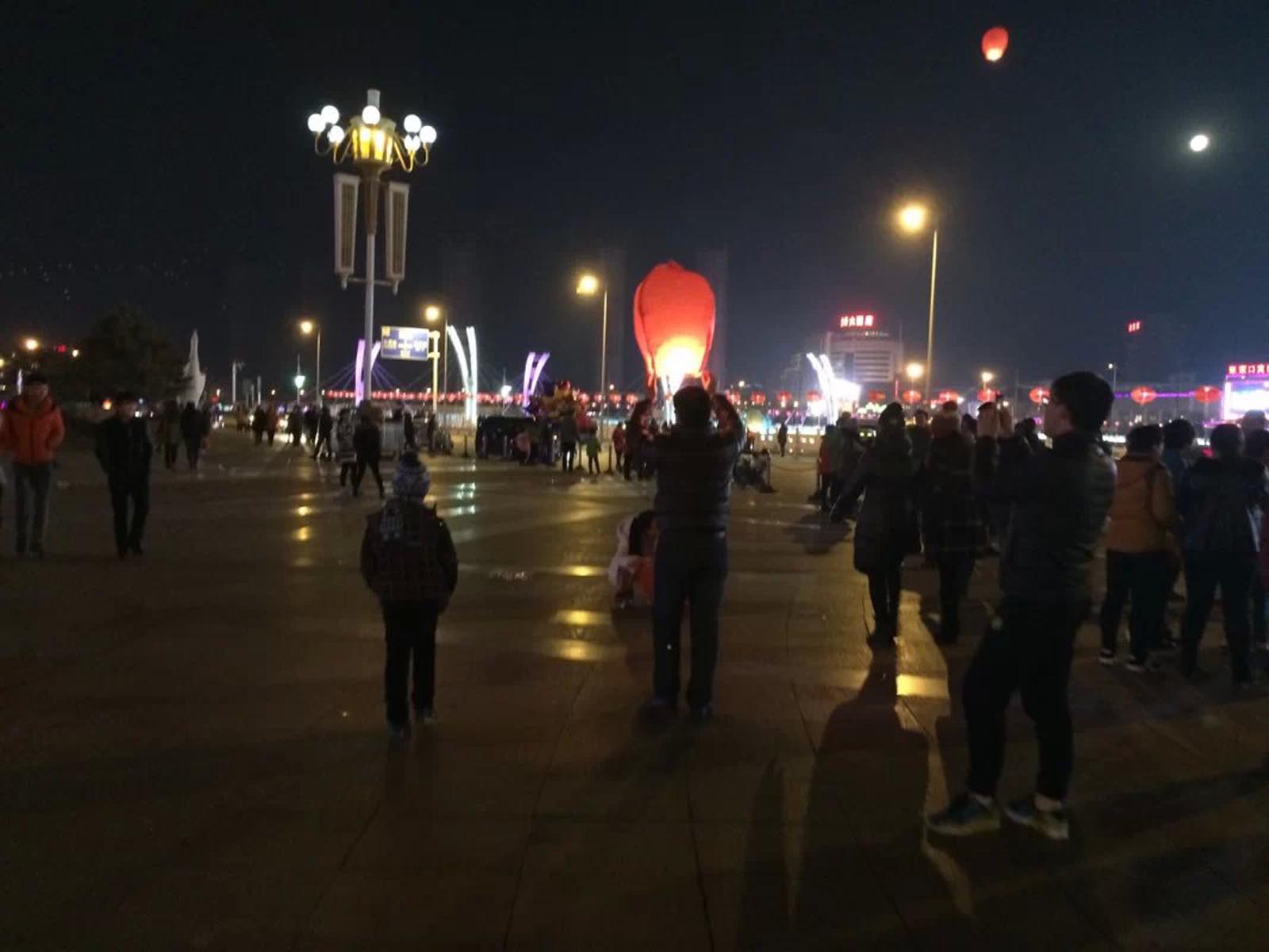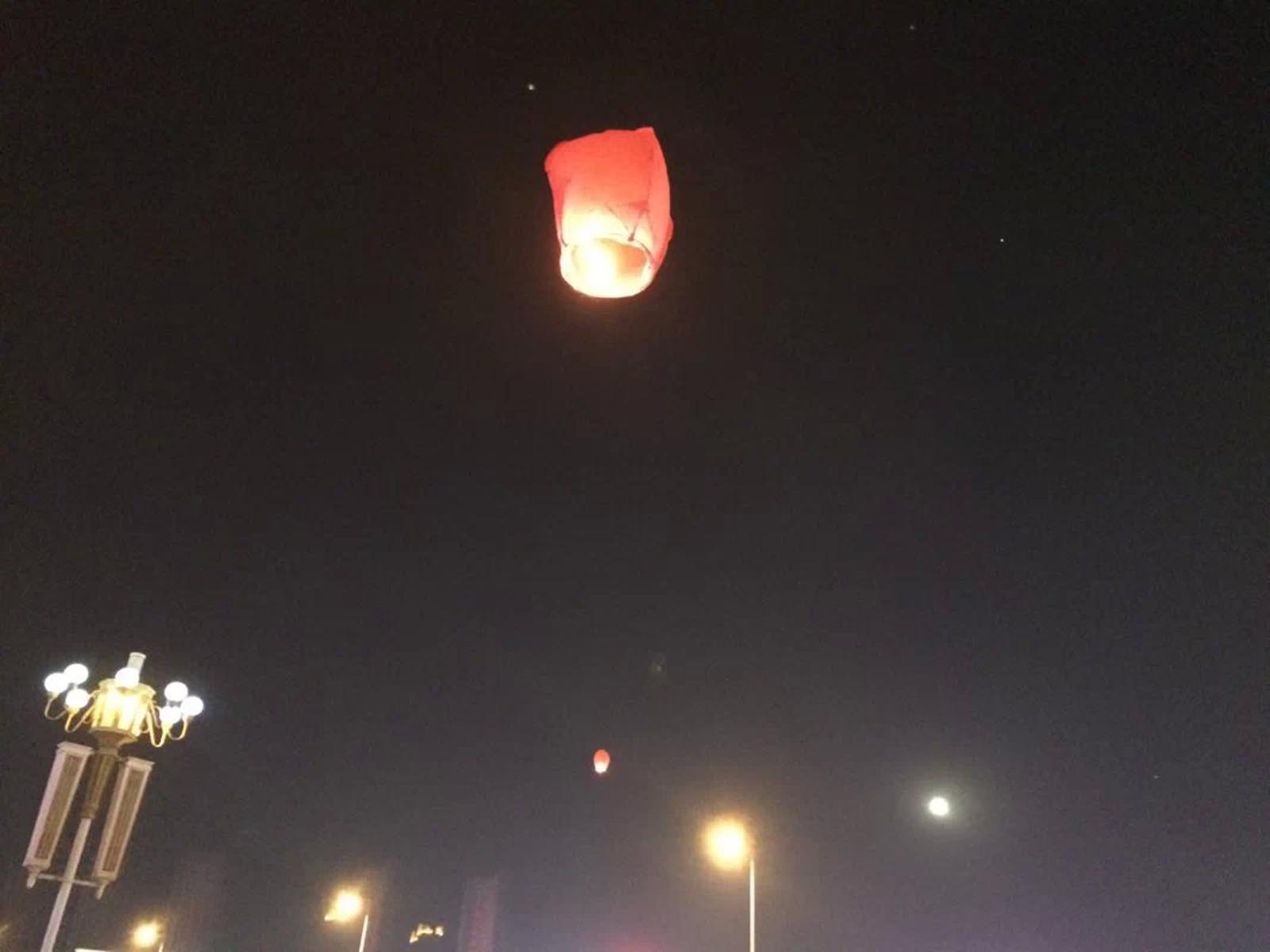 元宵节这天,广场上再没有往年的大型灯展,也没有了烟花晚会,但是吃过来广场观景的人还是特别多。五彩的霓虹灯把广场照得特别漂亮,还有好些人自己在放烟花,但最吸引我的是一个叔叔在放孔明灯。
