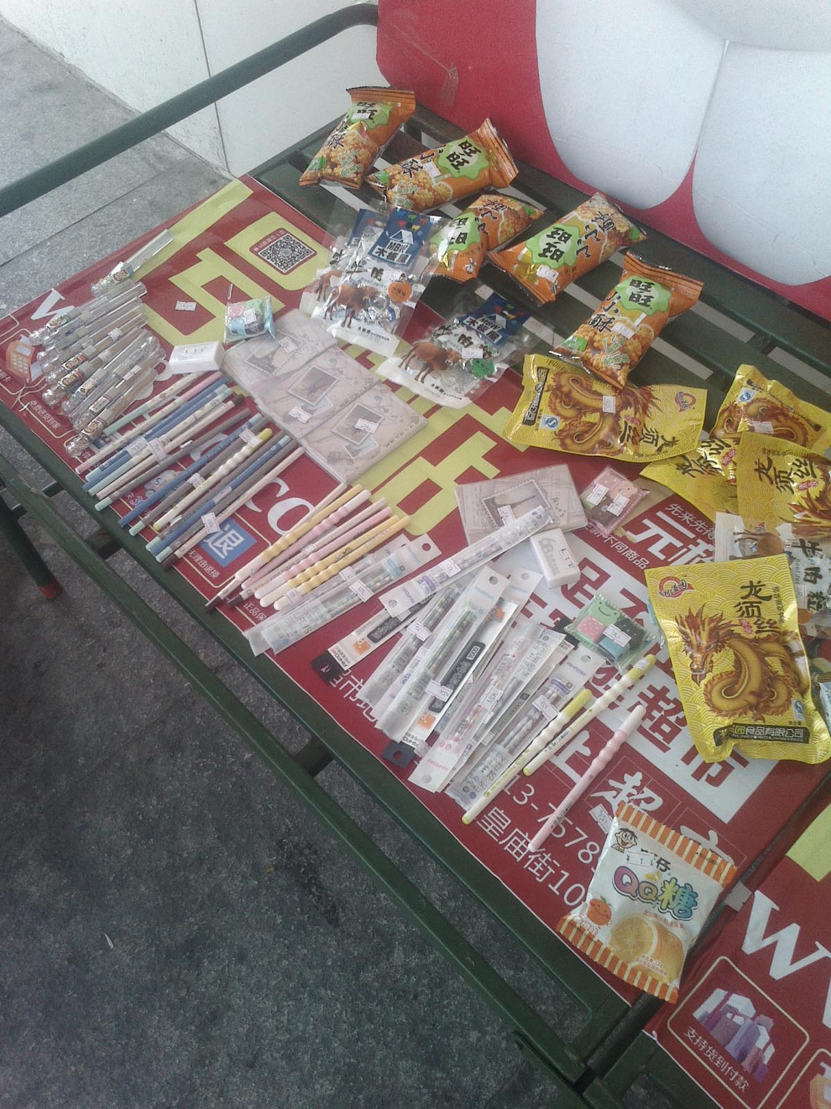 小床上的物品不算太多,有干馒头片、方便面、小笔记本,还有各种类型的笔,另外还有一些常用的小饰品。每件货物上都贴着价格,要买的人自动投钱就可以拿走。这可真是名副其实的便利店啊。
