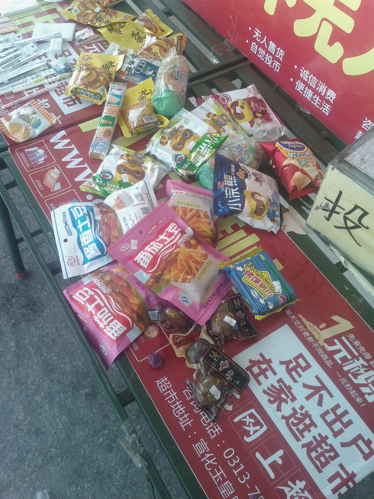 这个小店就在马路边人多的地方,规模只有一张小床,说它神奇最主要的是它没有售货员,价格都标在货品上,是多少钱自己投进投币箱里。