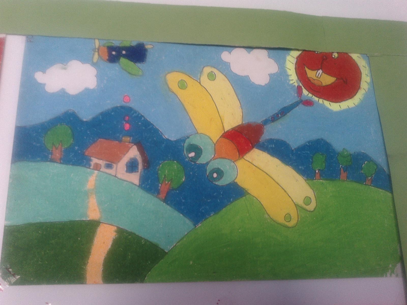 同学们画得大多是动物和自然风景,你看,一只大蜻蜓快乐地飞着,青山、绿草、小屋,我们的生活环境真美啊。房子里冒着炊烟,大自然的美尽收眼底,要是真能去这样的环境下生活该多好啊。