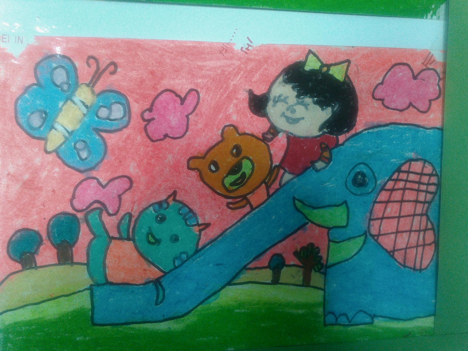 美术教室很大,有四间房那么大,在墙壁的中间贴满了五彩缤纷的画。画真多啊,色彩艳丽,形象逼真,画得真好。你看这副,一群小朋友在和大象玩儿,大象把鼻子伸得很长,小朋友们就把像鼻子当滑梯,玩得可高兴呢。人和动物和谐相处是多么开心的事儿啊。