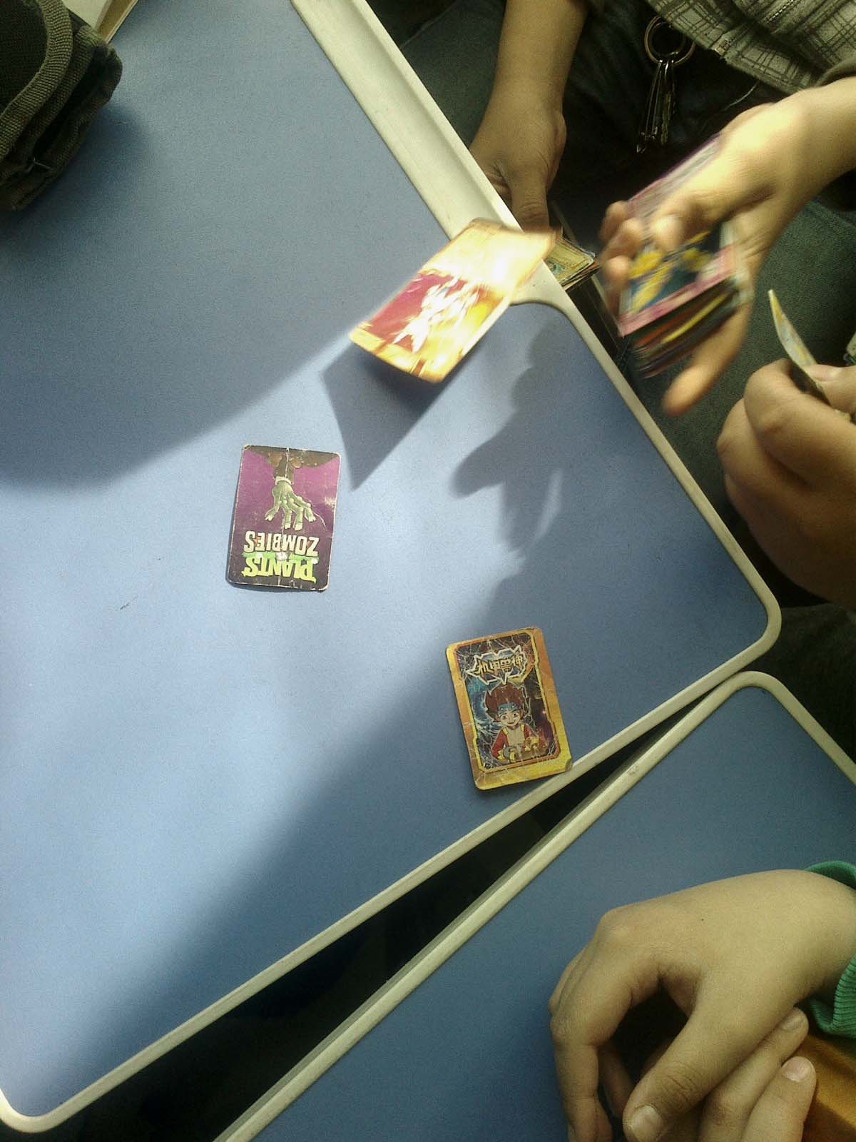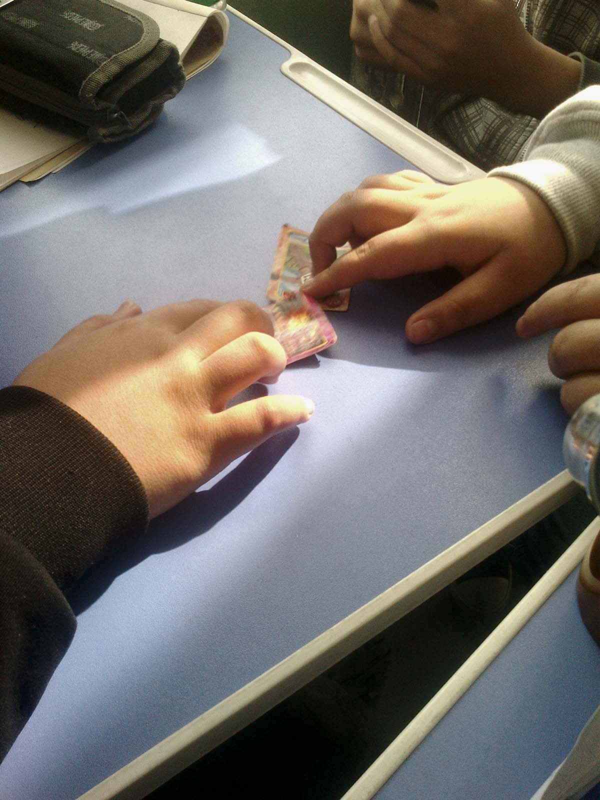 要问我们男生最喜欢的活动,那就是拍卡,每次下课十分钟都要抓紧时间玩一会儿。卡有大卡和小卡,上面都有美丽的图画,这些一般都是从方便面里得到,或是从商店里买来的。当然有的同学赢得卡多了也卖。