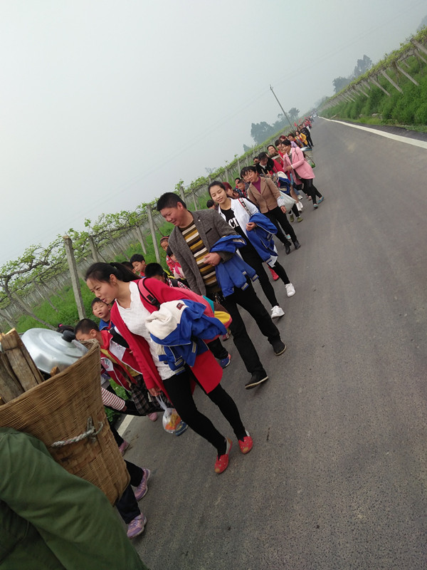 星期五早上,我们按组长分配的任务带上所必需的材料,怀着盼望已久的心情来到学校。学生排两列,家长排一列在学生的左边,走在路上好把我们学生保护起来,,确保我们的安全。在路上,大家们欢声笑语,你一言我一语,高高兴兴地走着。行走在猕猴桃观光大道,穿过猕猴桃基地,大约走了1小时,我们终于来到了目的地――"九曲水",这儿景色优美、绿树成阴、居然还能看到金黄的油菜花。
