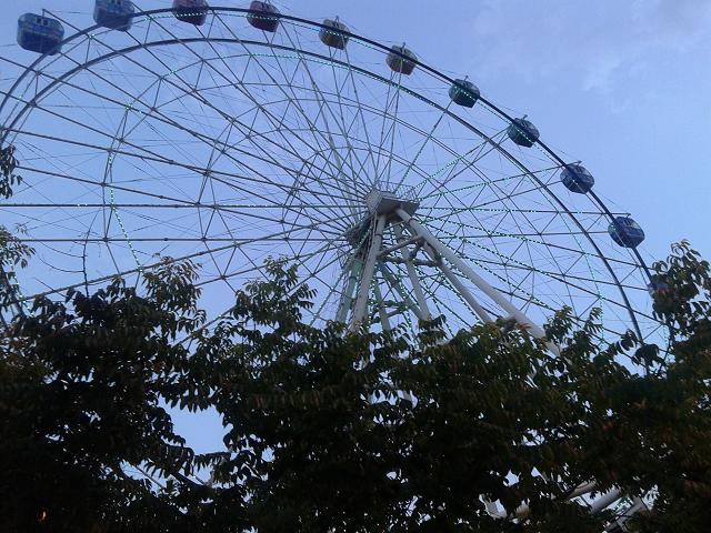 在公园里有一个游乐场,里面那些游乐设施令我眼花缭乱。首先映入眼帘的是那高大且富有浪漫气息的摩天轮。好想坐那摩天轮在日落时摘一两颗星星,两三抹发红的云