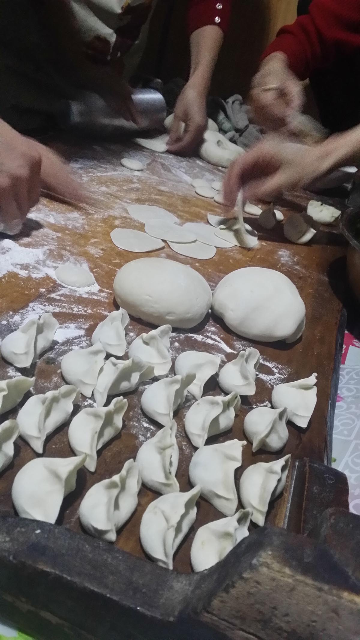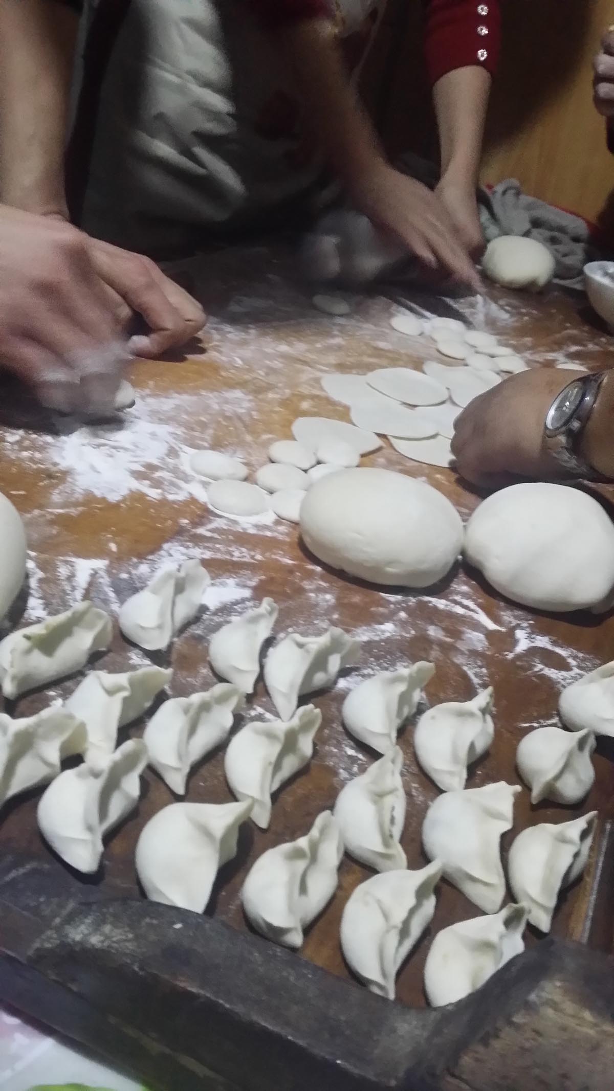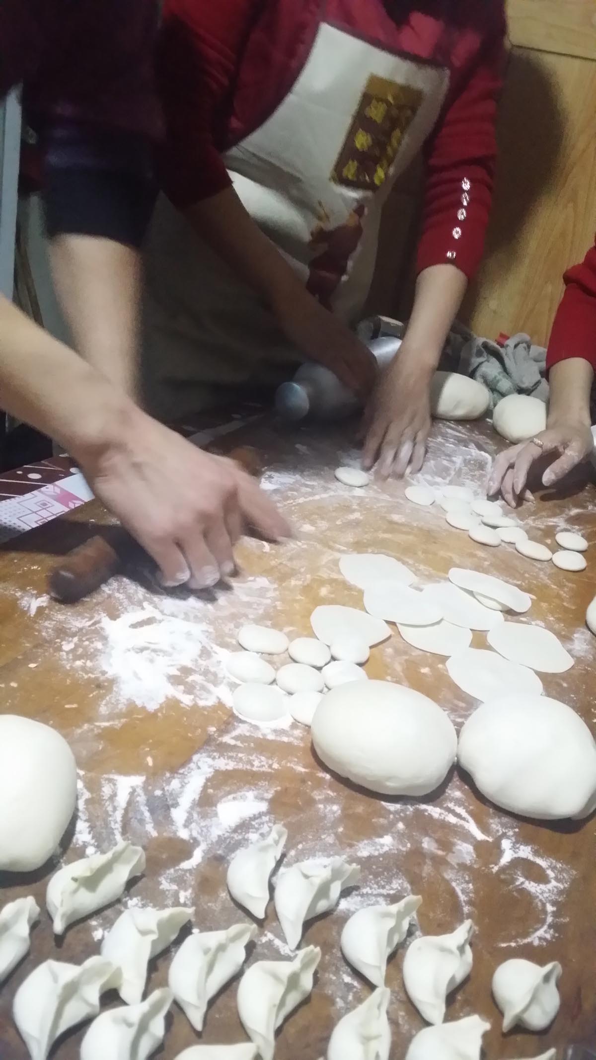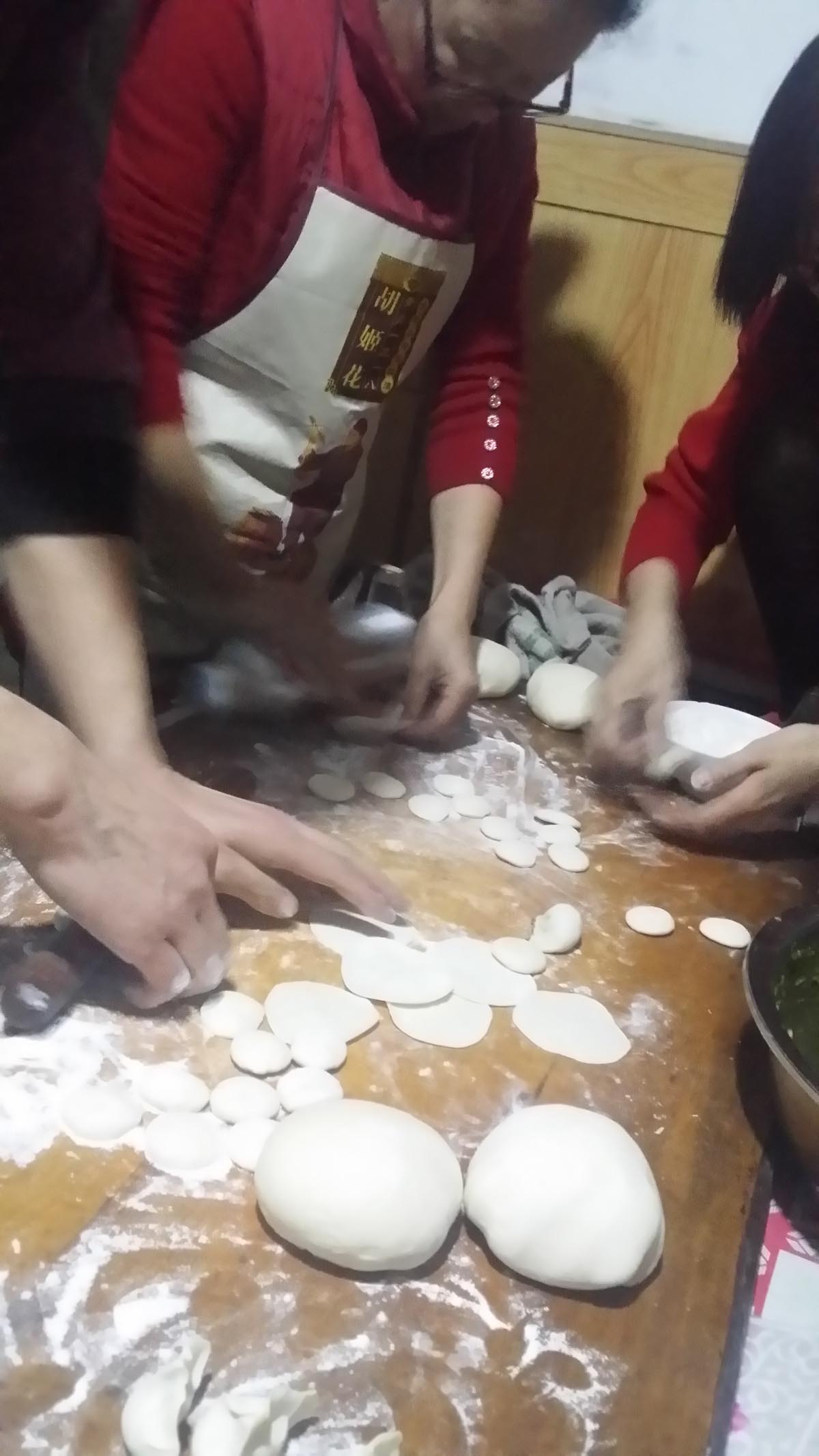 爸爸,妈妈还有婶婶、姑姑在边说边笑地做饭,她们有的包饺子,有的拣菜,有的剁肉,还有好几个包饺子。其中包饺子组是最红火的,她们边说笑话边包,还有的搞恶做剧,妈妈就给姑夫抹了一脸白面,样子可滑稽了。