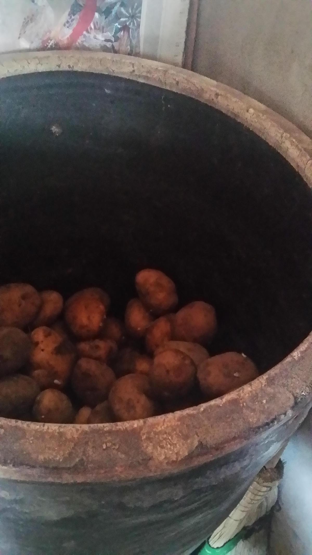 一个大瓦缸,现在人家很少见到了,老人们的家里都有,放水、放面、腌菜用。这种瓦缸边壁厚,还透气但不漏水。放在这种瓦缸里有好几个好处,第一,耗子不吃;第二,山药不容易生芽,缸内温度较外面低;第三,山药不发齁。