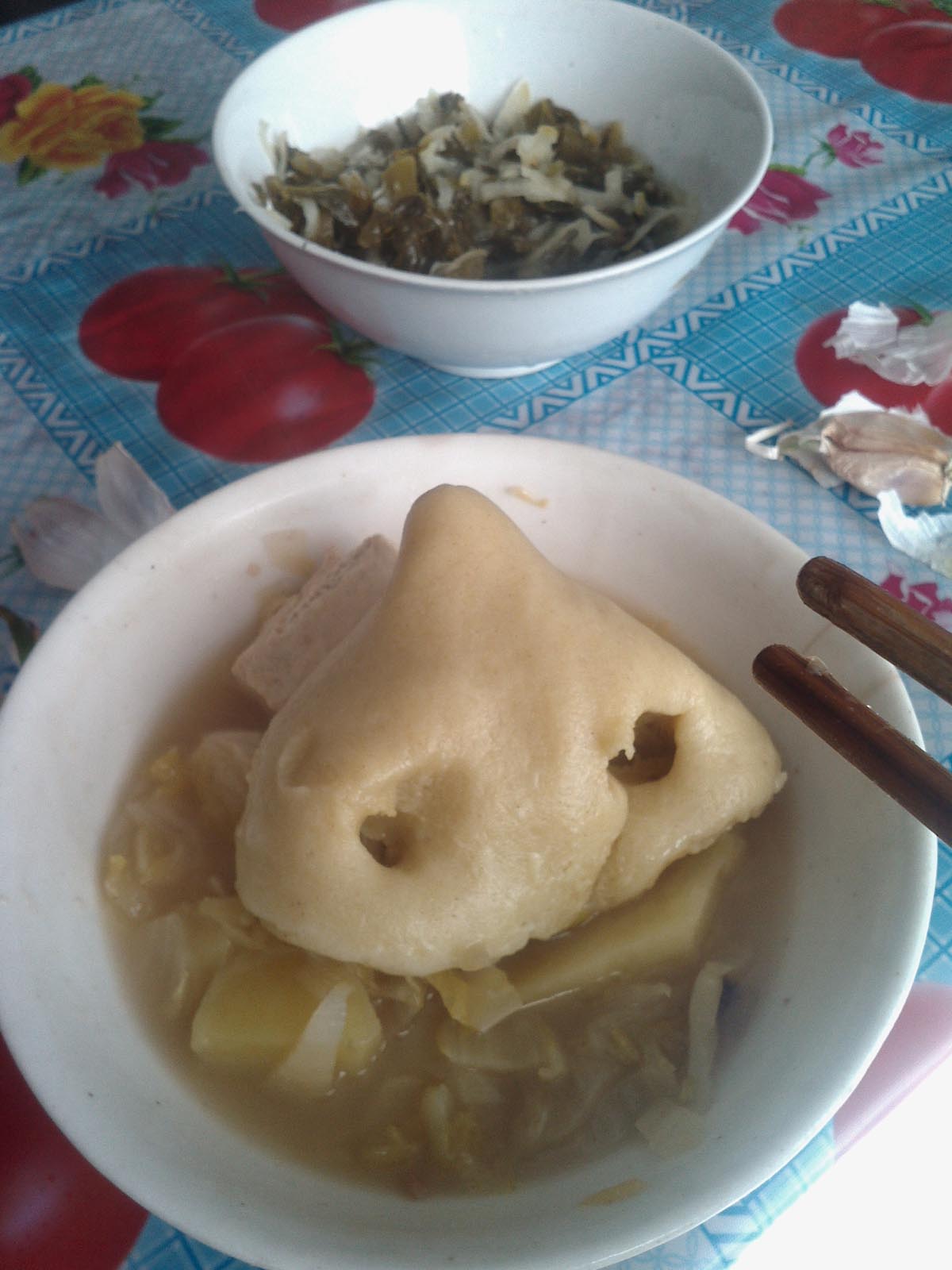 然后就是技术活了,用和好的糕面捏成一个个窝窝,中间空,四壁及顶端的厚度要一致,薄一些才好熟。也不能太薄了,否则蒸熟就塌陷了。大爷蒸窝窝的技术可是一绝,捏的时候什么样儿,蒸出来就是什么样子,既劲道又薄又好吃。