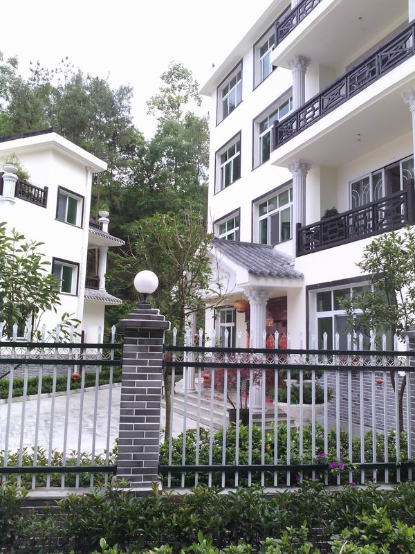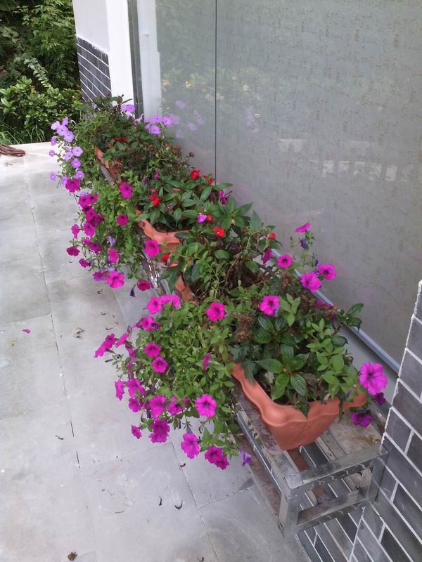 我们一路看,一路玩,不知不觉走到水泥路的尽头。按理说,路的尽头应该比较荒凉,可就在这里,有两幢最好的别墅。窗台放着花盆,紫色喇叭花的藤蔓垂下来,盖住窗台下的墙壁。屋顶阳台上,几根柱子的顶端就是花盆,栽种着花儿。房子旁边,几个花圃中栽满了花花草草,矮小的万年青和其它灌木修剪得漂漂亮亮;洁白的栀子花弥漫在整个花圃,空气中溢满了它沁人心脾的花香;鲜艳的一簇簇杜鹃花耀眼的开着,房子周围缀满了它紫红色的花。置身这里,就是置身于花的海洋。