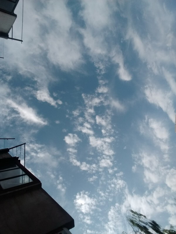 天气比较晴朗的时候,天空中点缀着星星点点的云。过了一阵子,云朵聚拢,变幻成一条小狗。